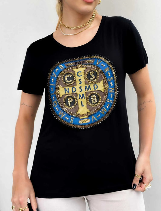 Saint Benedict Cross T-Shirt with Hand Embroidered Rhinestones