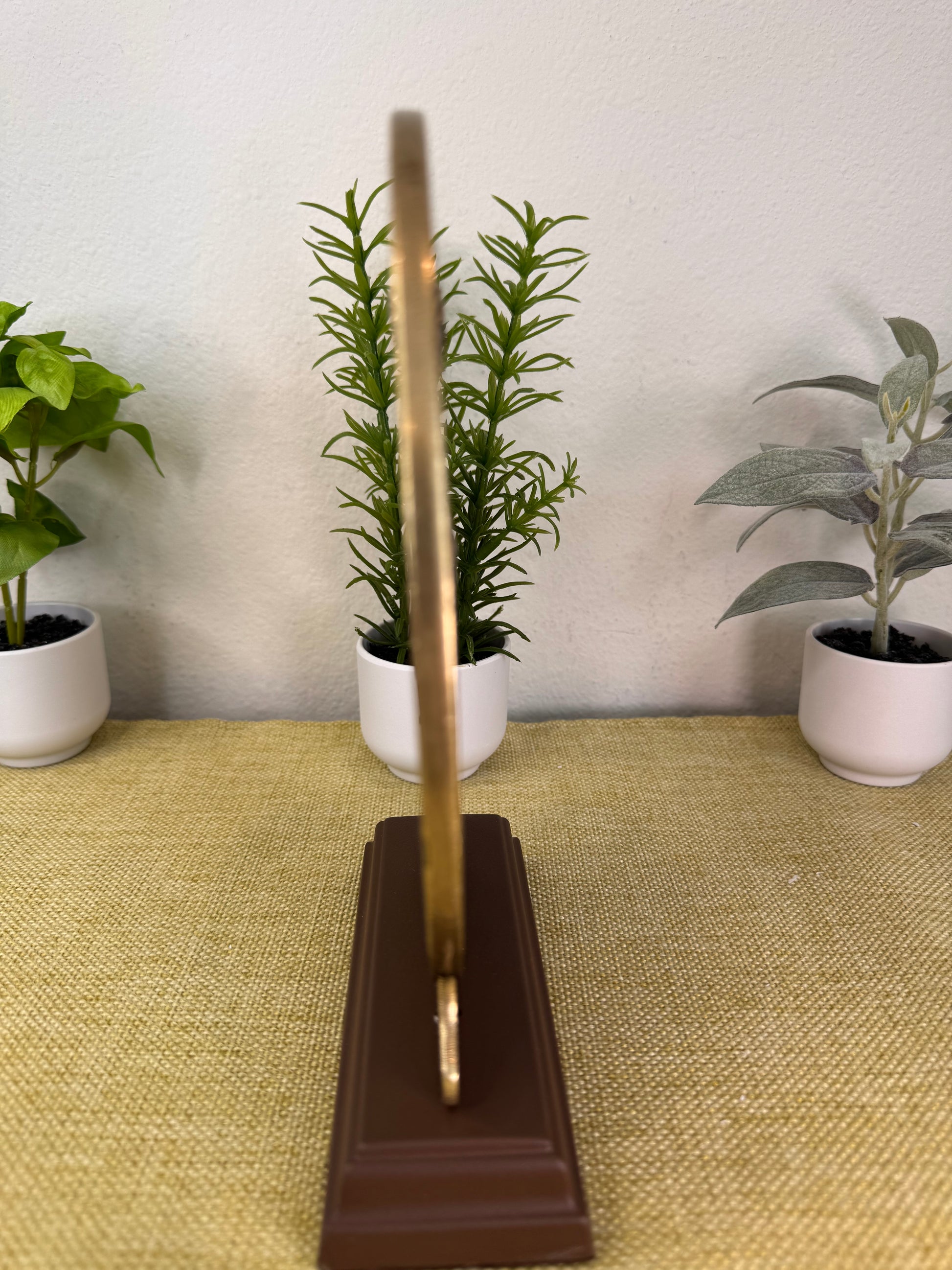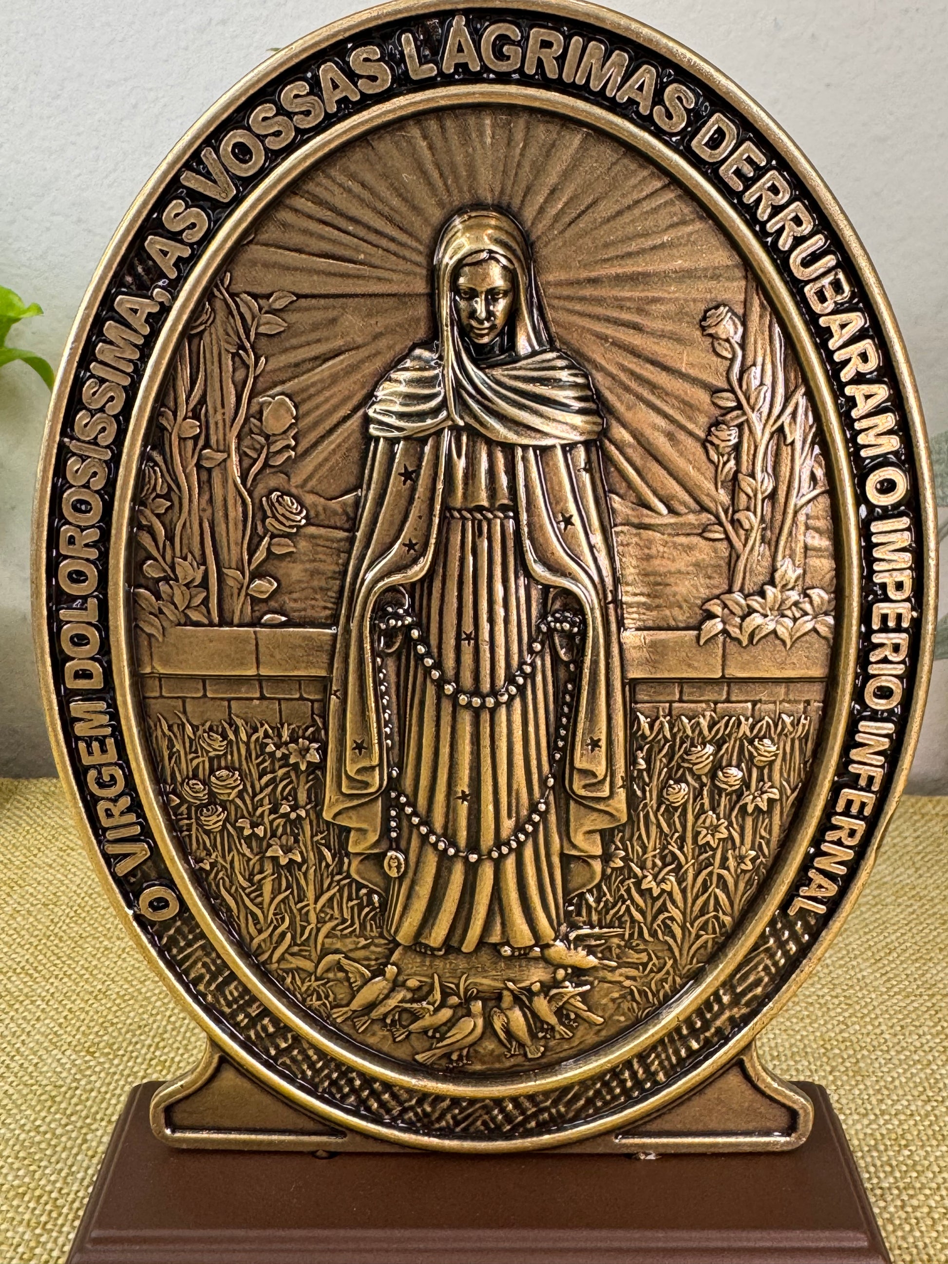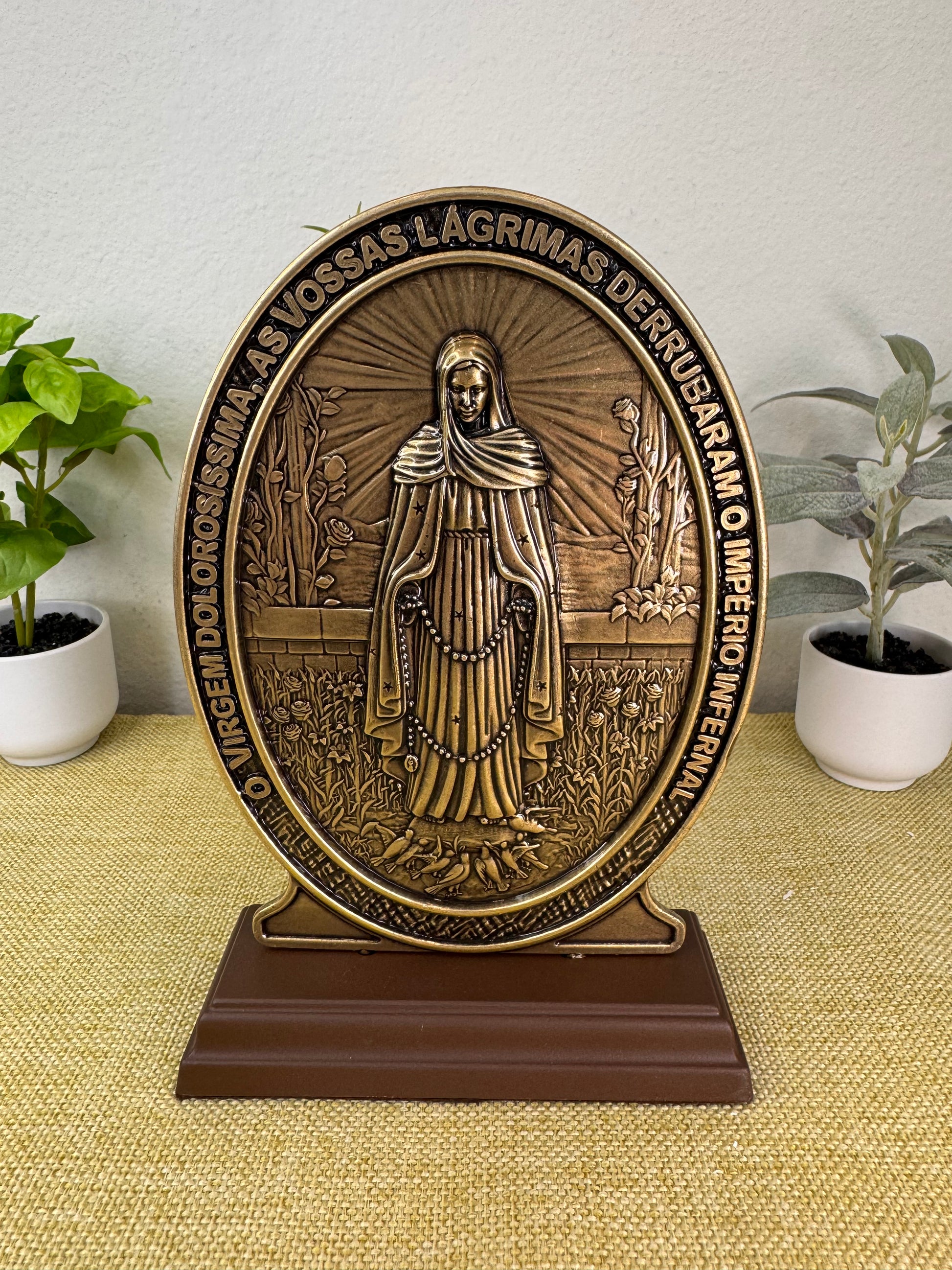 Religious ornament of Our Lady of Tears and Jesus in chains. Piece in old gold finish, 19 cm high, richly detailed and fixed to a wooden base, ensuring stability and elegance. Ideal for moments of devotion and decoration of sacred spaces.