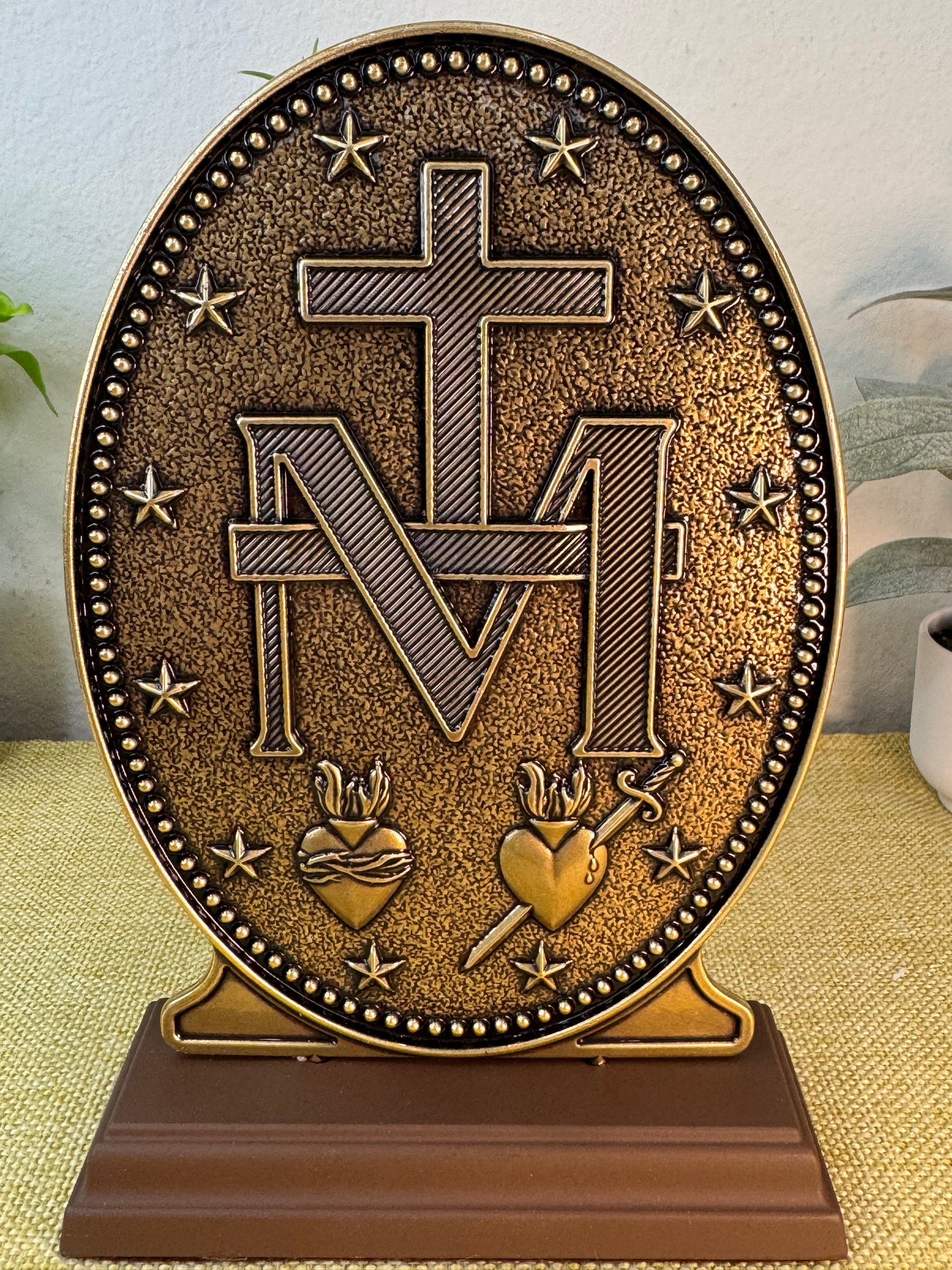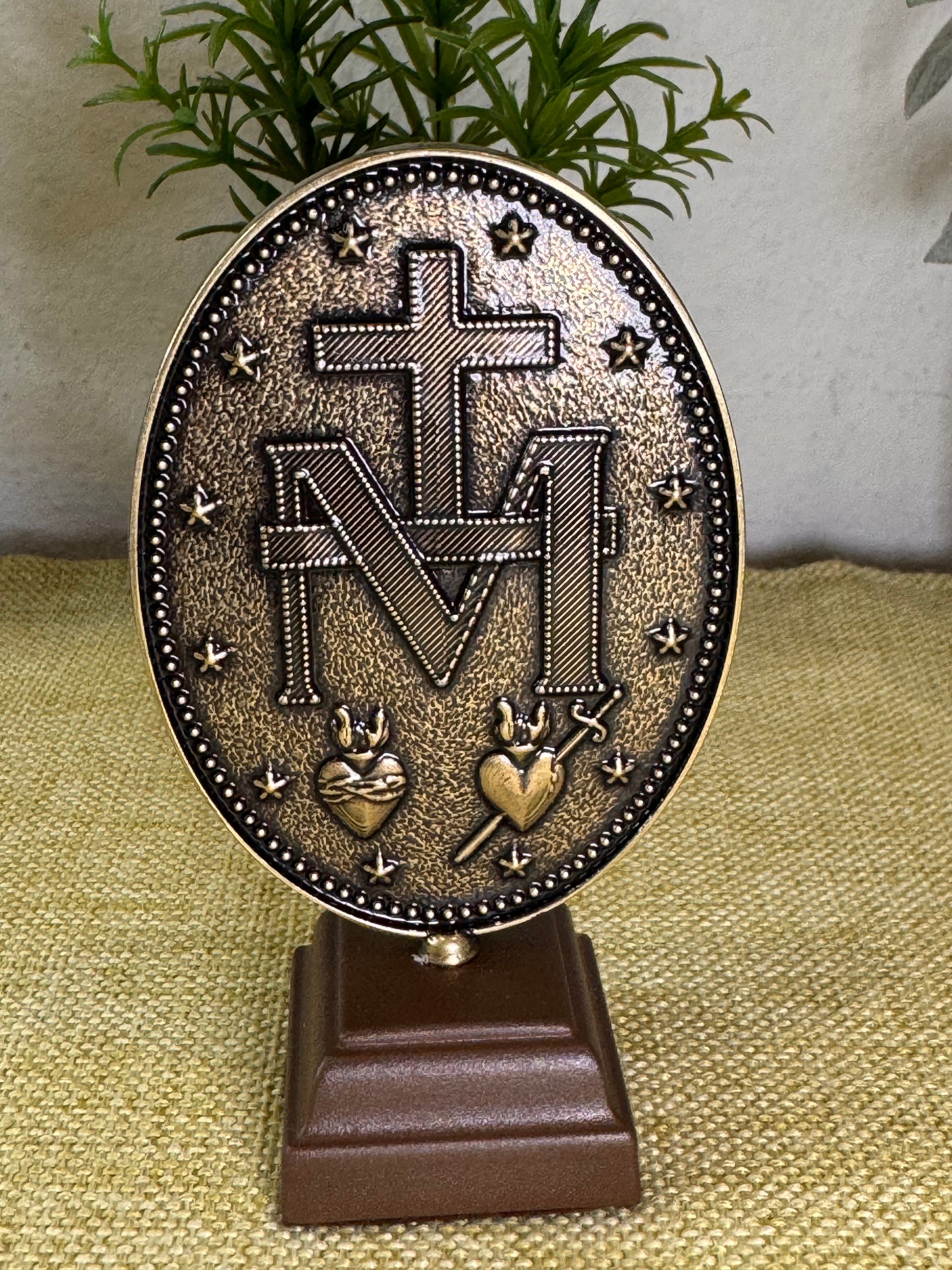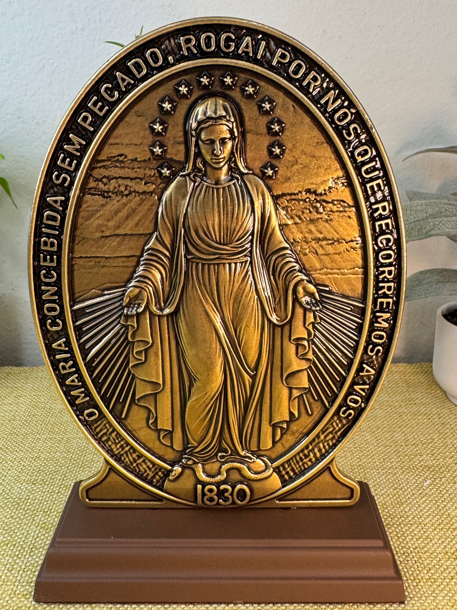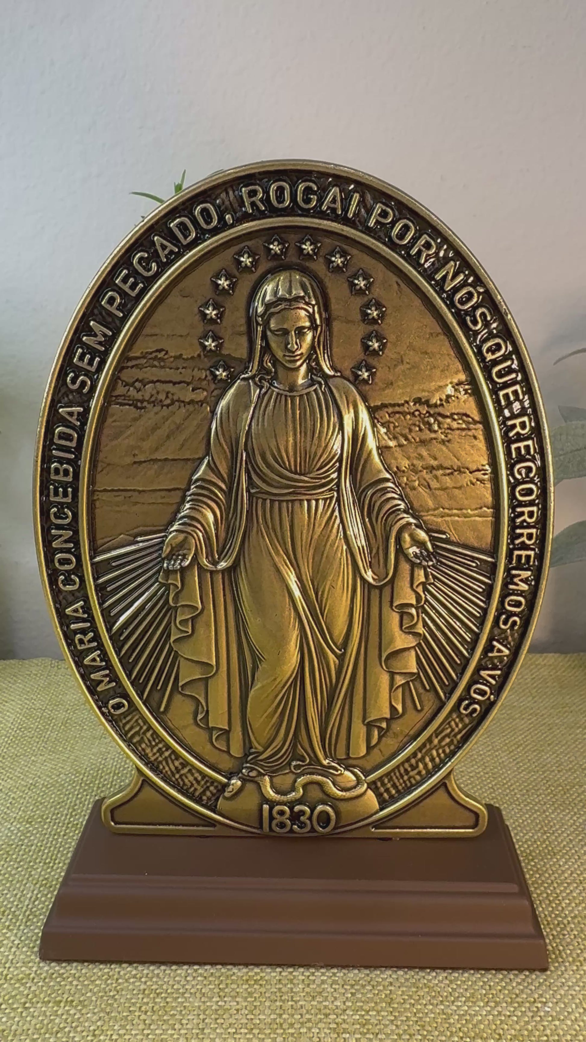 Bring protection and beauty to your home with this delicate ornament of Our Lady of Graces 🙏. Made of metal with a wooden base 🌳 and an old gold finish 🏅, it combines faith and elegance in every detail.