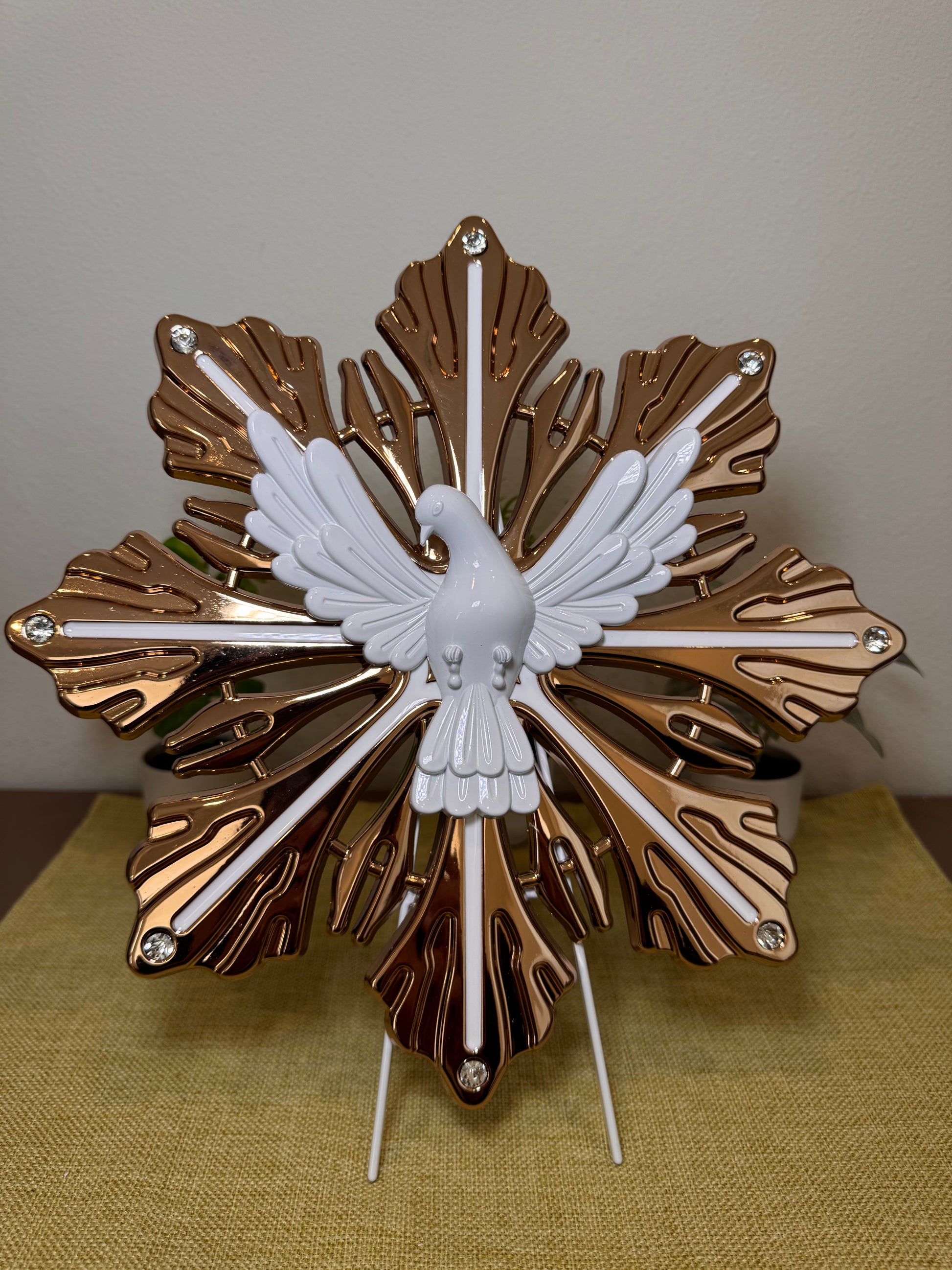 Illuminate your home with faith and beauty with the Divine Splendor Holy Spirit Ornament . Produced with a light gold finish, this piece represents the presence and protection of the Holy Spirit, bringing peace and harmony to the environment. With an elegant design and delicate details, it is ideal for decorating living rooms, bedrooms, prayer spaces or any environment that deserves a touch of spirituality.