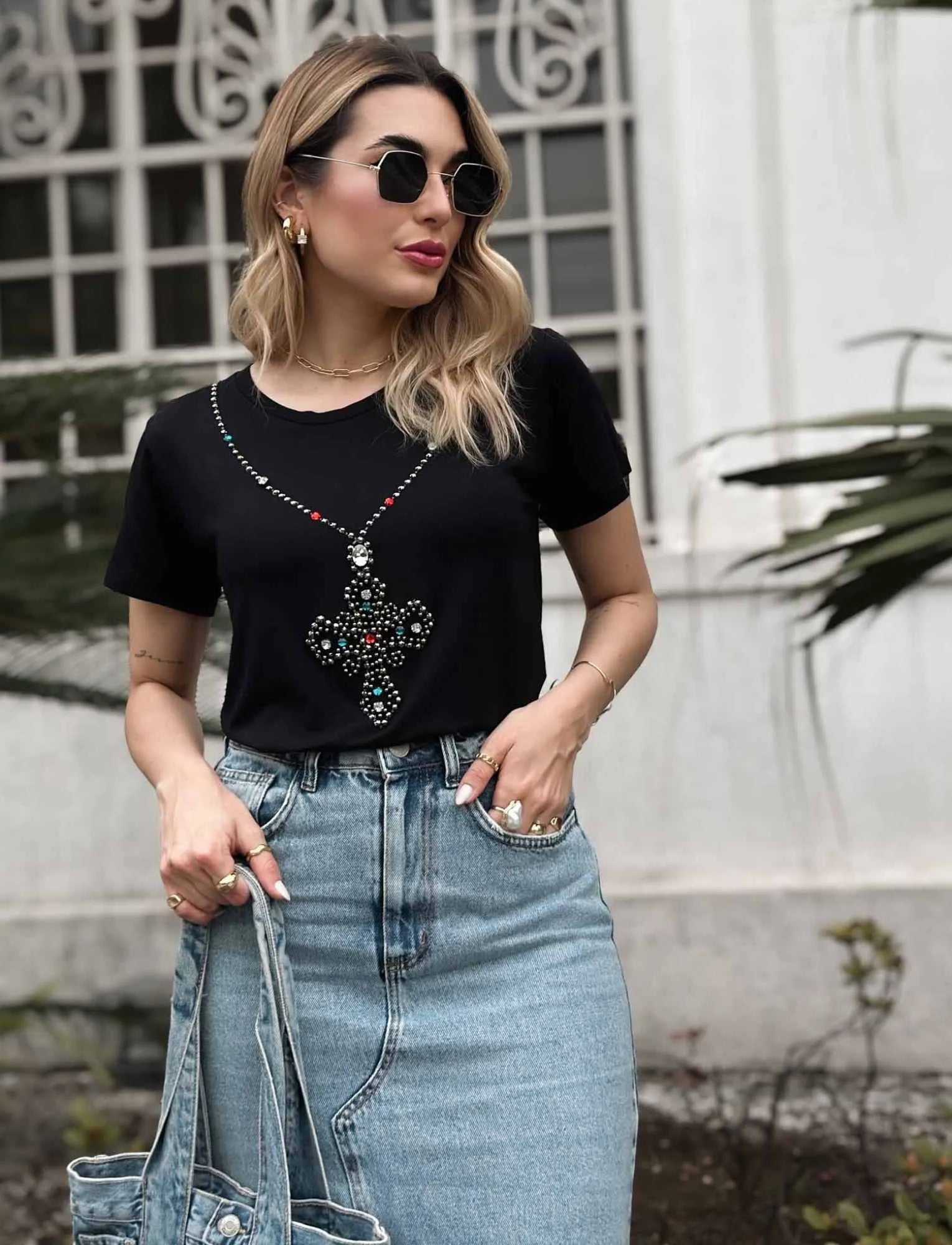 Carry your faith with you in style and sophistication with the Hand Embroidered Crucifix with Rhinestones T-Shirt ! ππ Made from soft and comfortable fabric βοΈ, this exclusive piece features a beautiful crucifix carefully embroidered by hand, enriched with rhinestones that provide shine and elegance β¨.