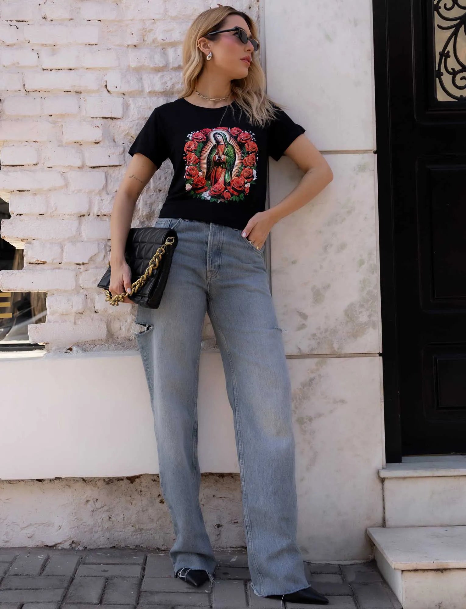 The Our Lady of Guadalupe T-Shirt is perfect for those looking for a piece that combines spirituality and style. With a beautiful image of Our Lady of Guadalupe surrounded by floral details, it is carefully hand-embroidered and adorned with sparkling rhinestones , bringing a special touch of luminosity and sophistication. 🌷🙏