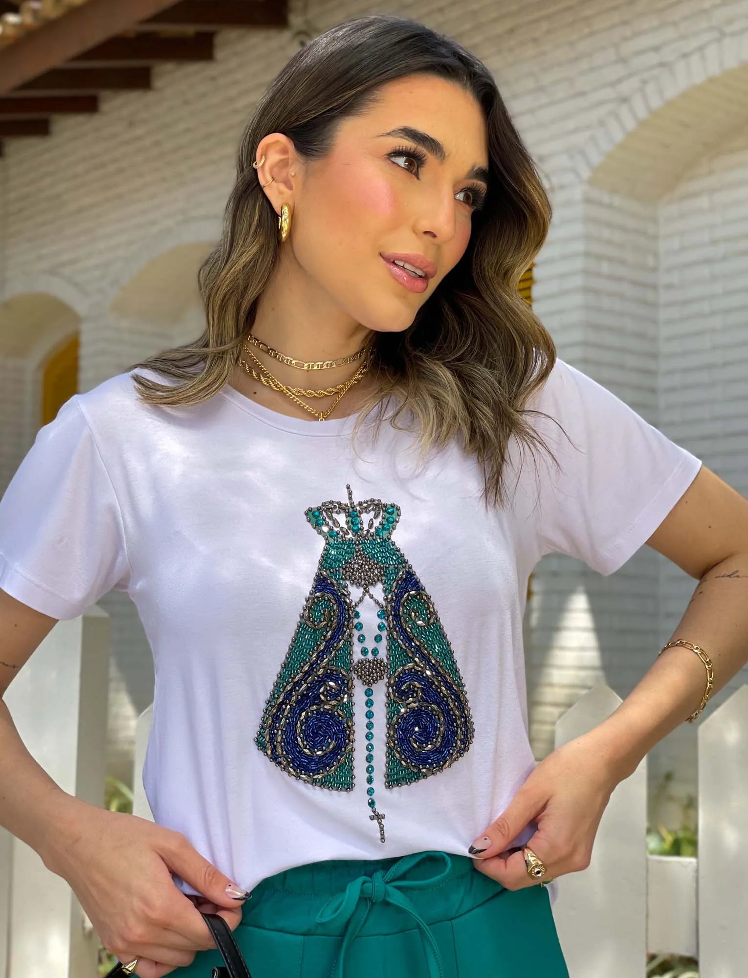 Wear your faith with delicacy and sophistication with the Our Lady Rosary T-Shirt with Hand Embroidered Rhinestones ! 💖💎 Made in soft and comfortable fabric ☁️, this exclusive piece features the image of Our Lady holding a rosary 🌹, with hand-embroidered details and rhinestones that provide shine and elegance ✨.