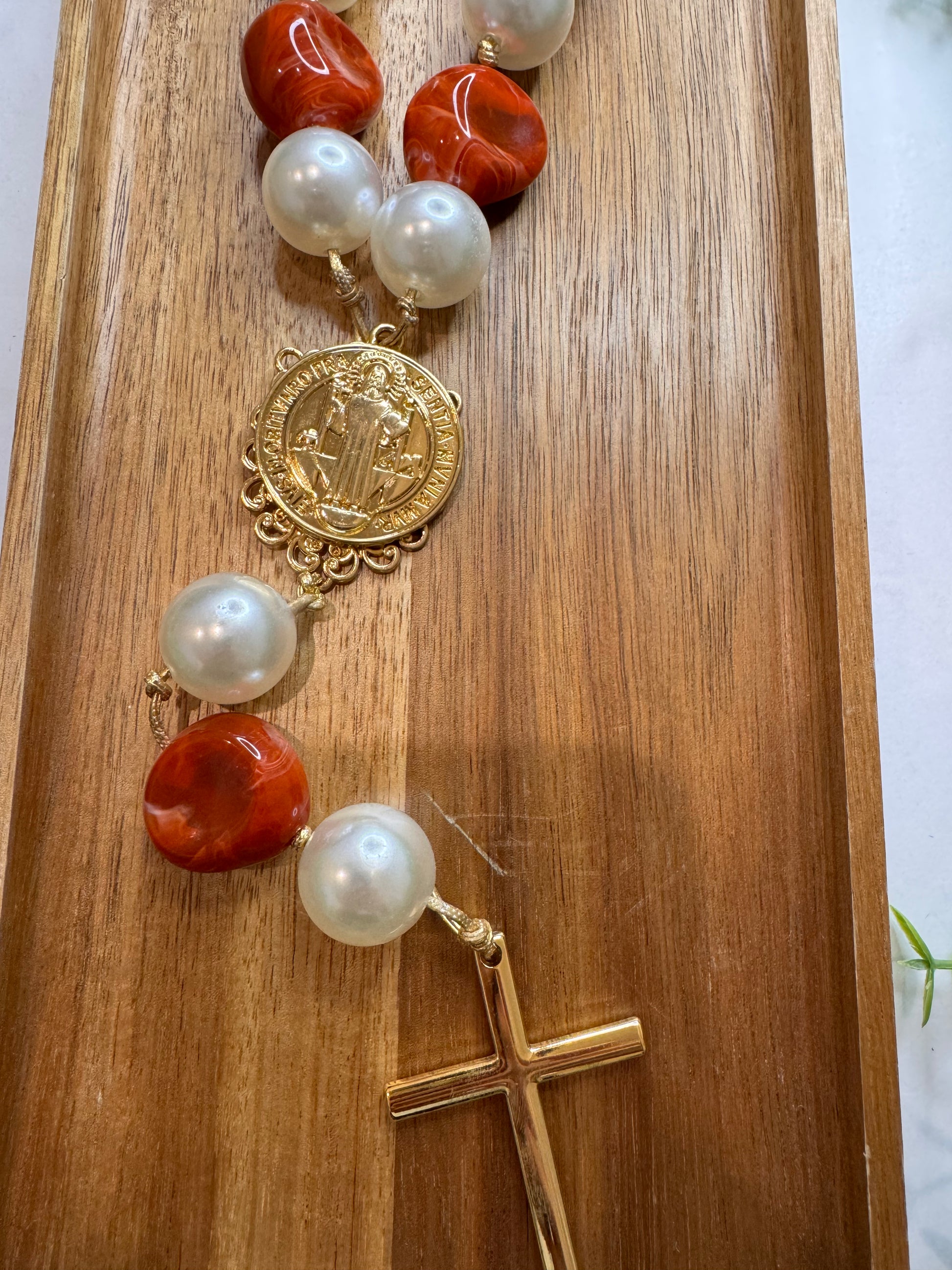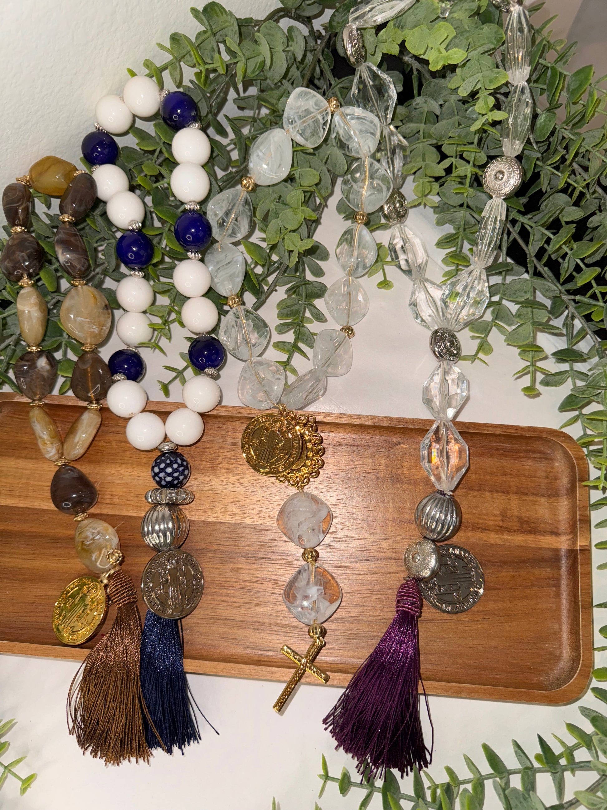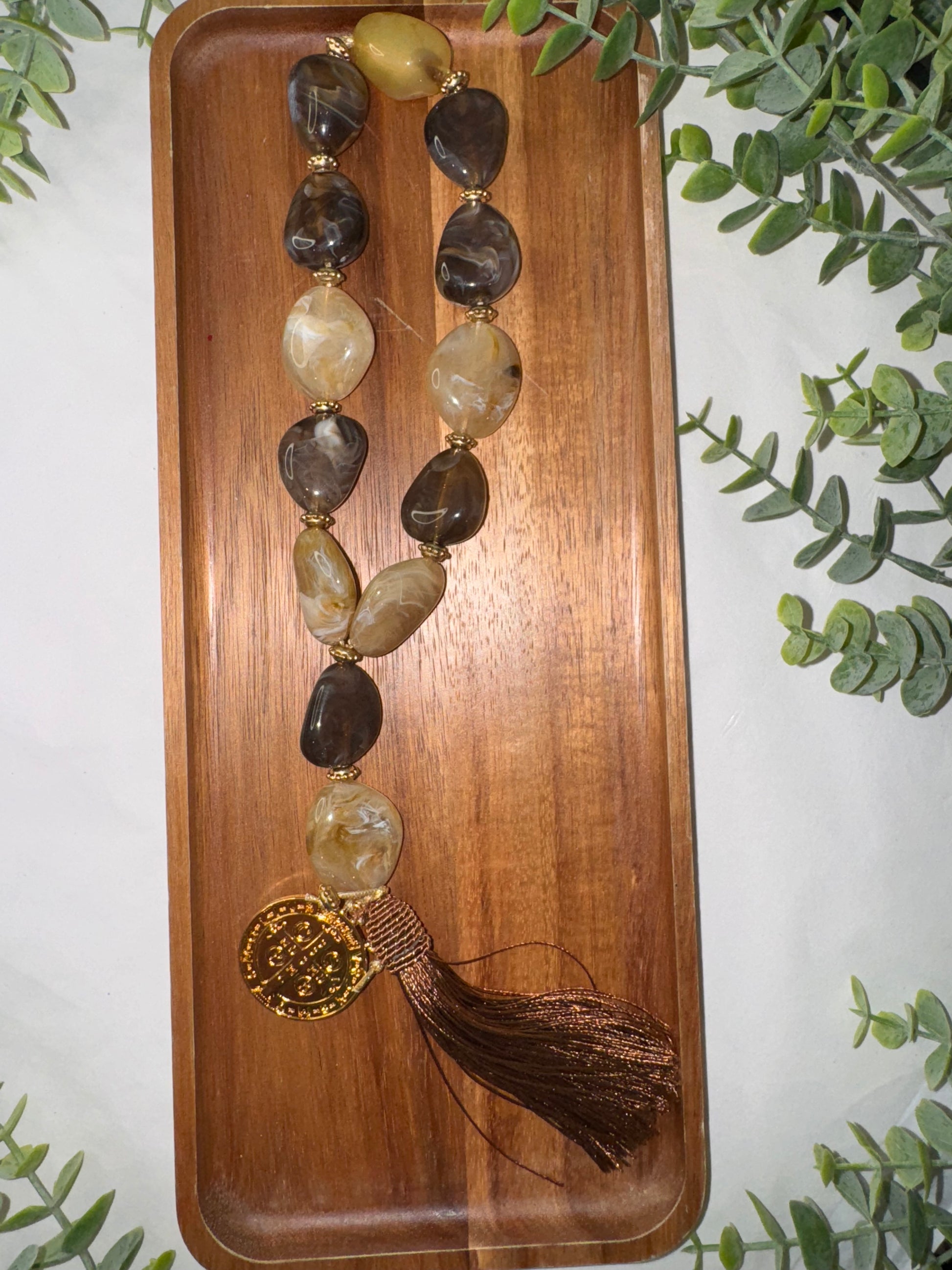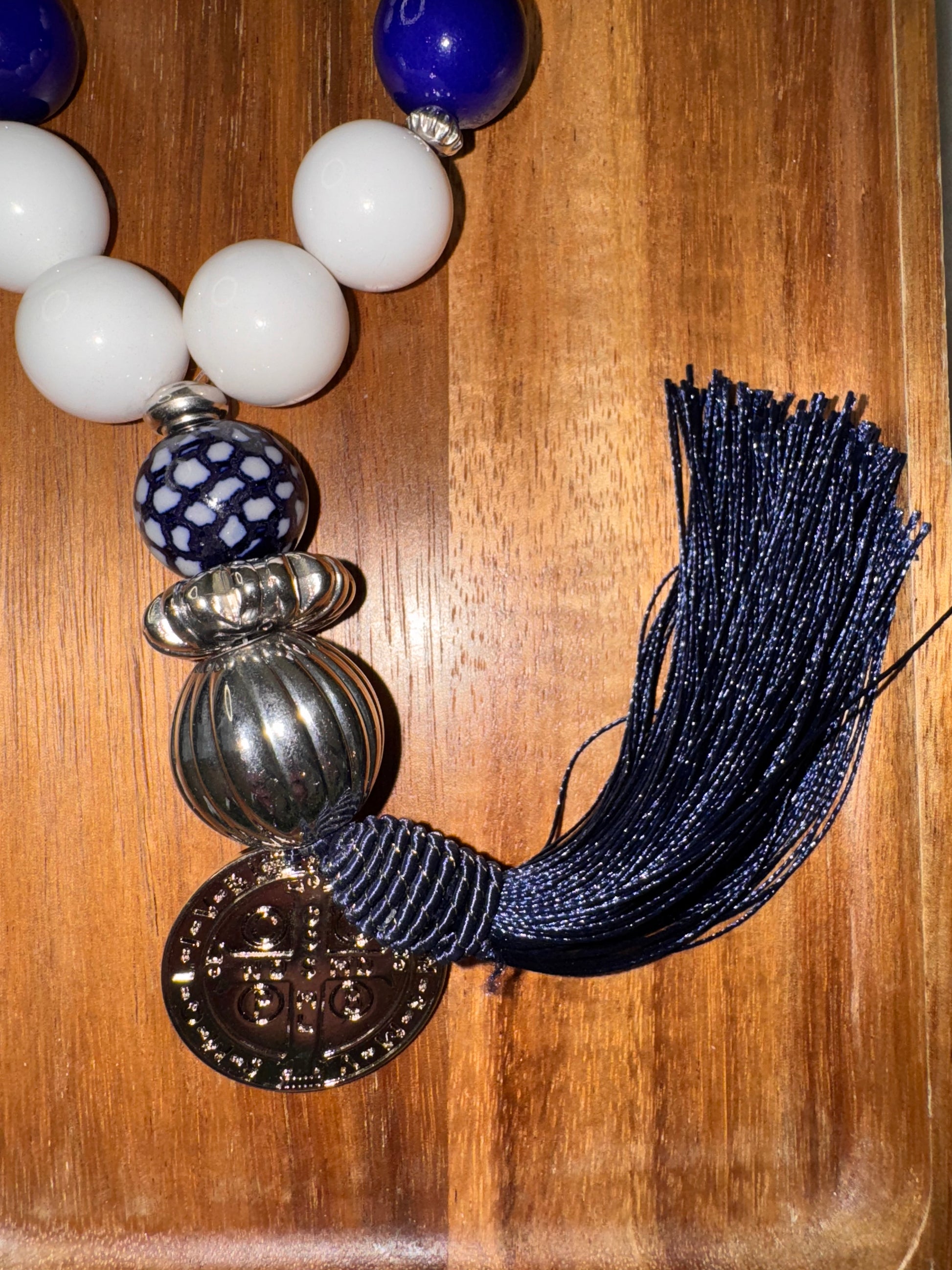 A handcrafted piece made with love and faith, this table necklace is made up of carefully selected ceramic beads and finished with the powerful Saint Benedict Medal.