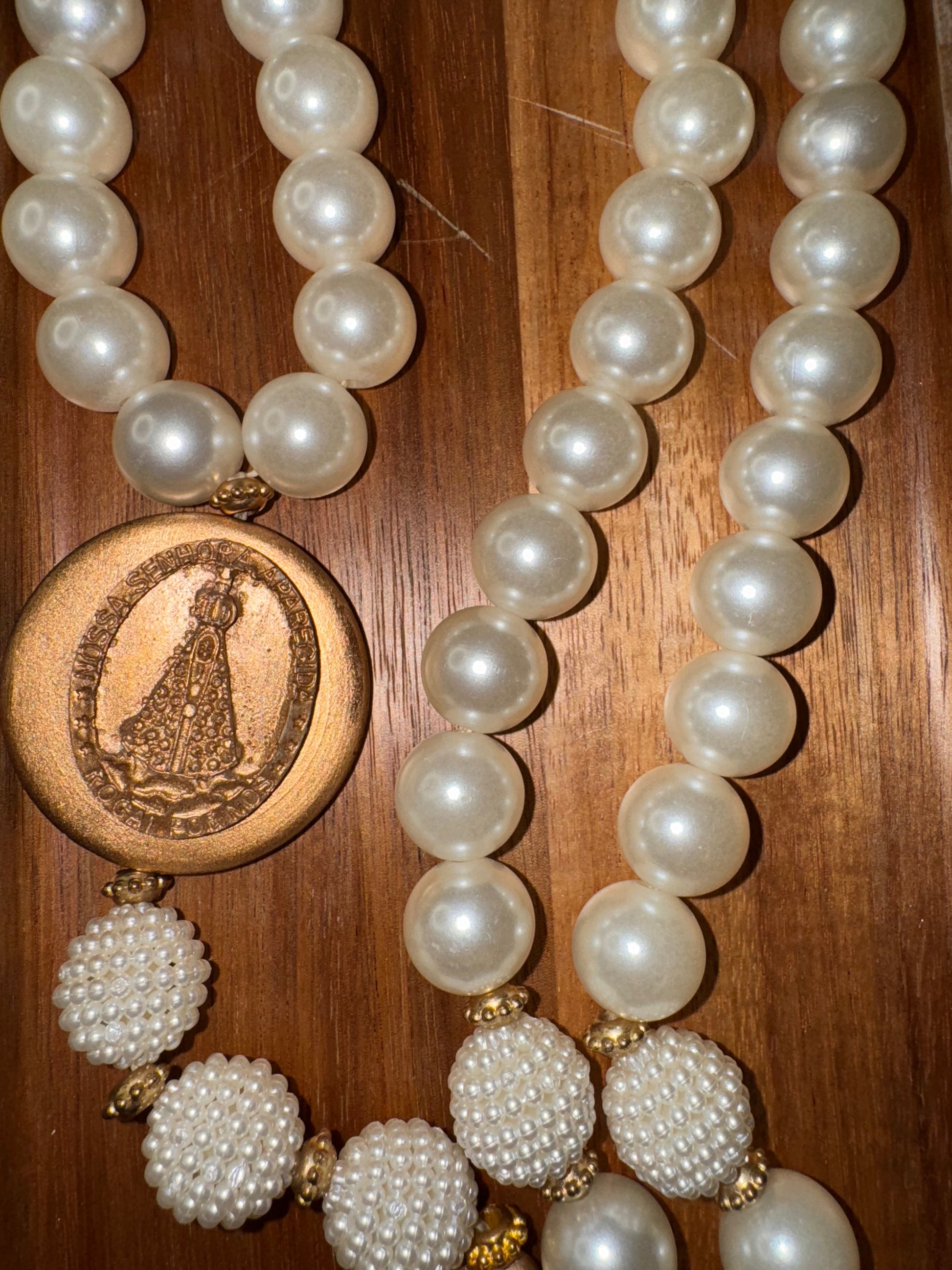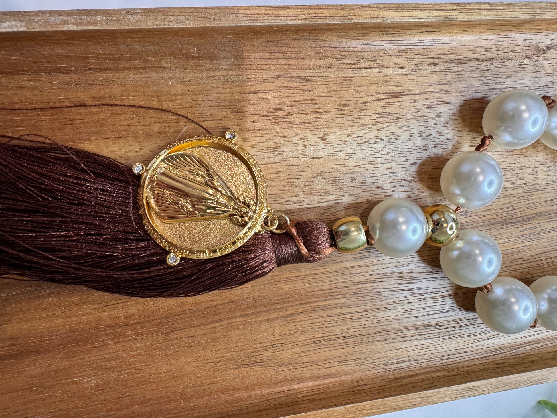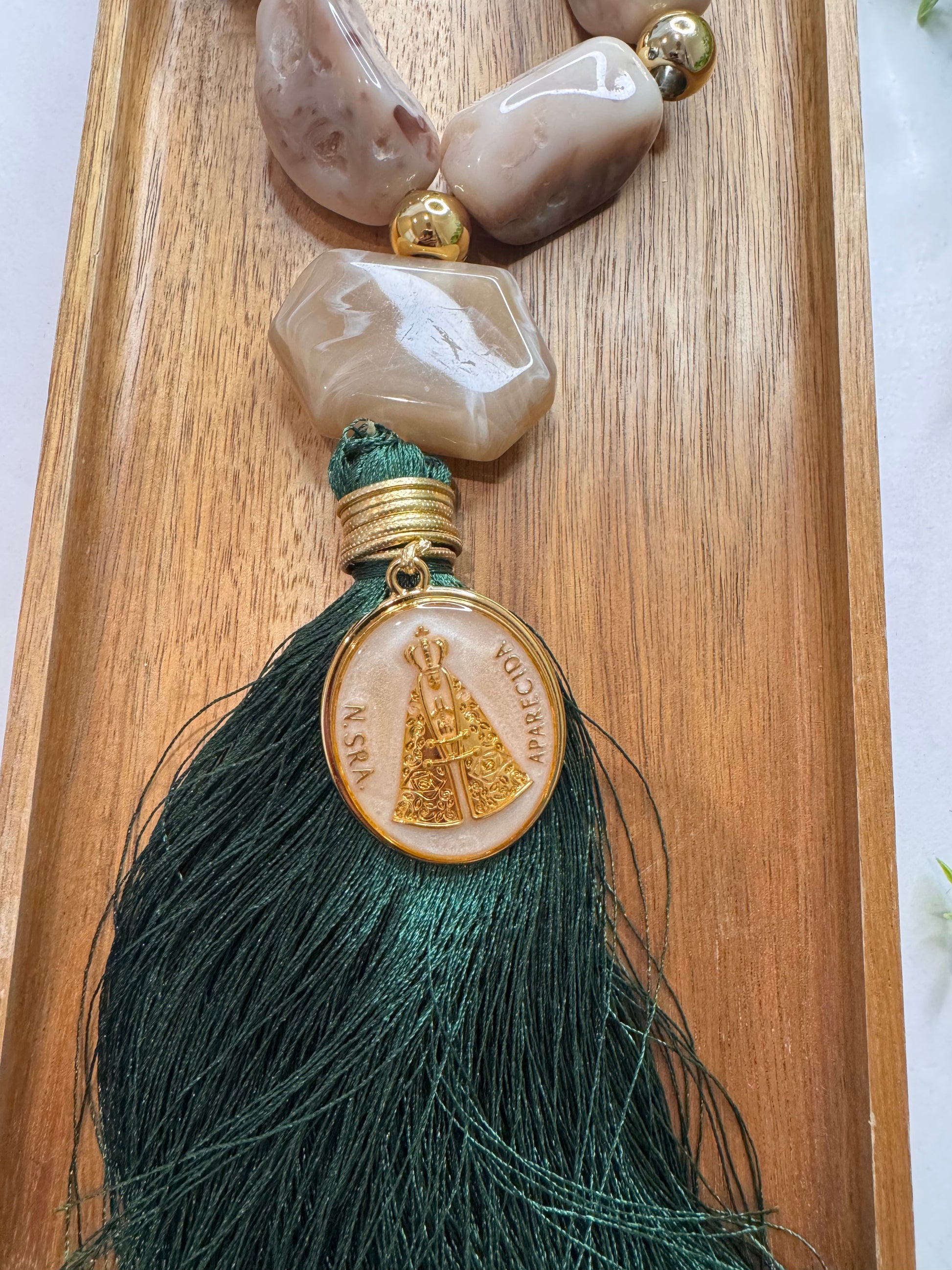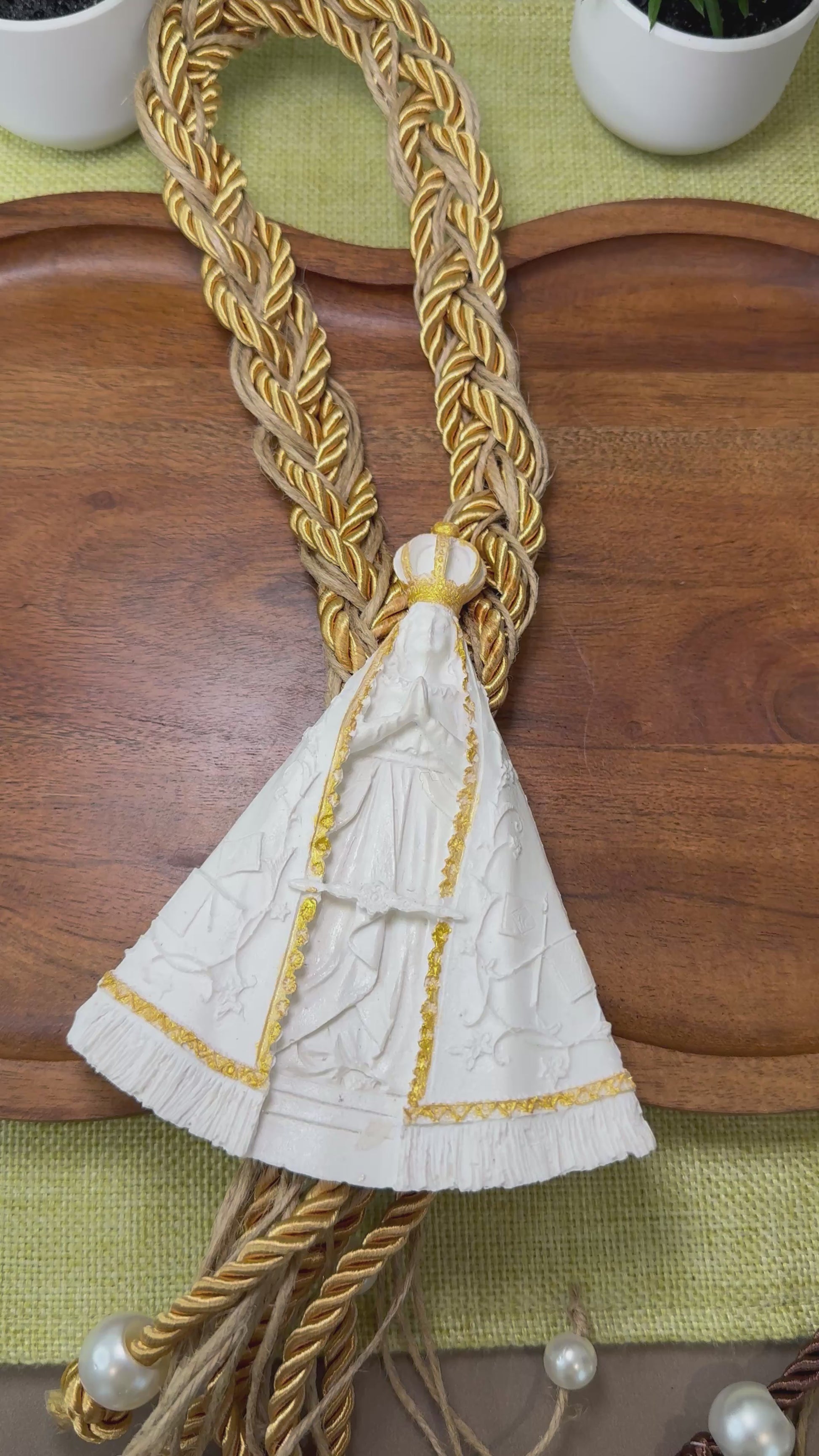 Bring even more faith and elegance to your home with the Our Lady Decorative Table Necklace. Made with sophisticated materials, it combines natural tones, braided details and delicate pearls, creating a unique and meaningful look.