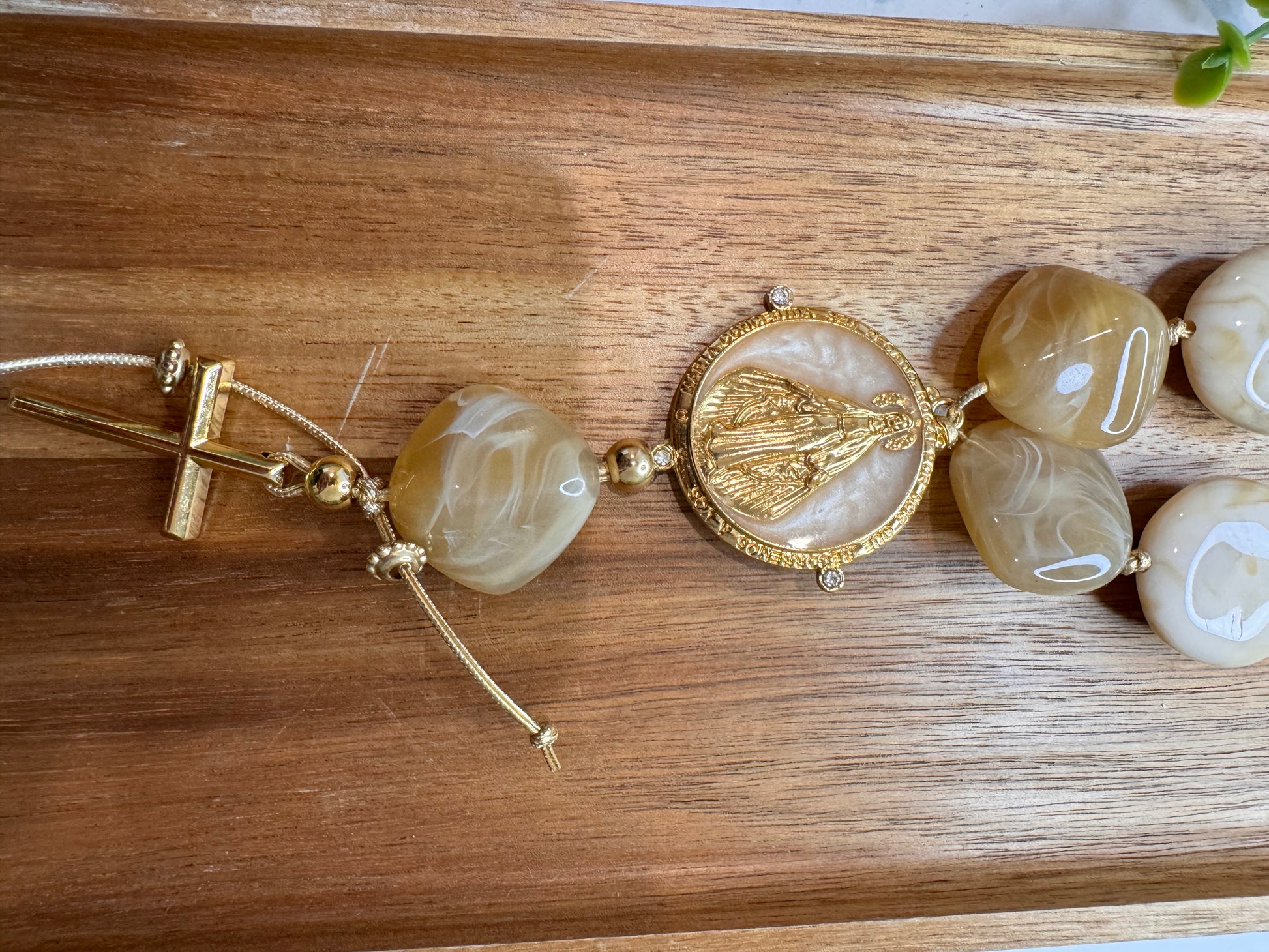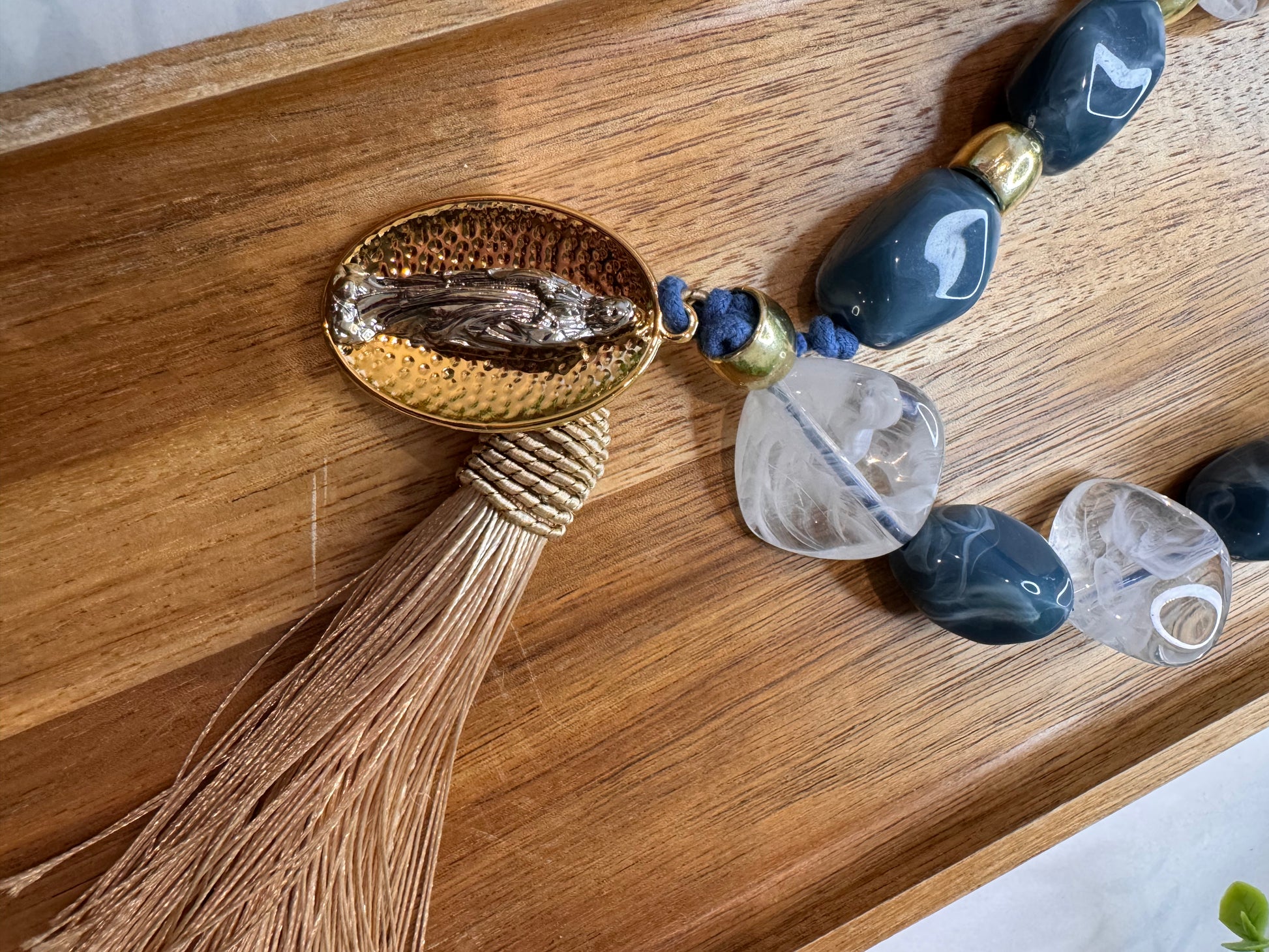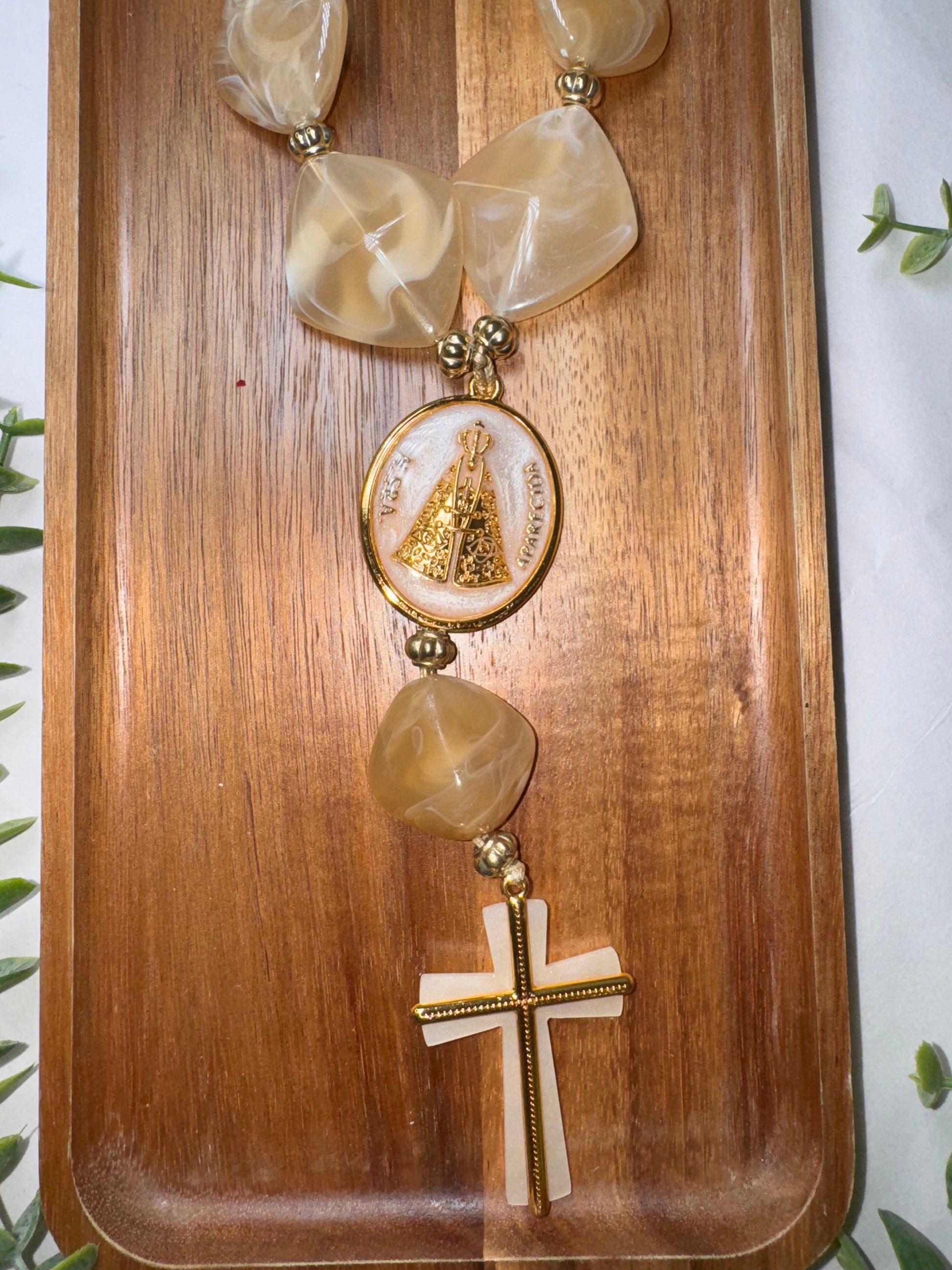 Bring even more faith and elegance to your home with the Our Lady Decorative Table Necklace. Made with sophisticated materials, it combines natural tones, braided details and delicate pearls, creating a unique and meaningful look.