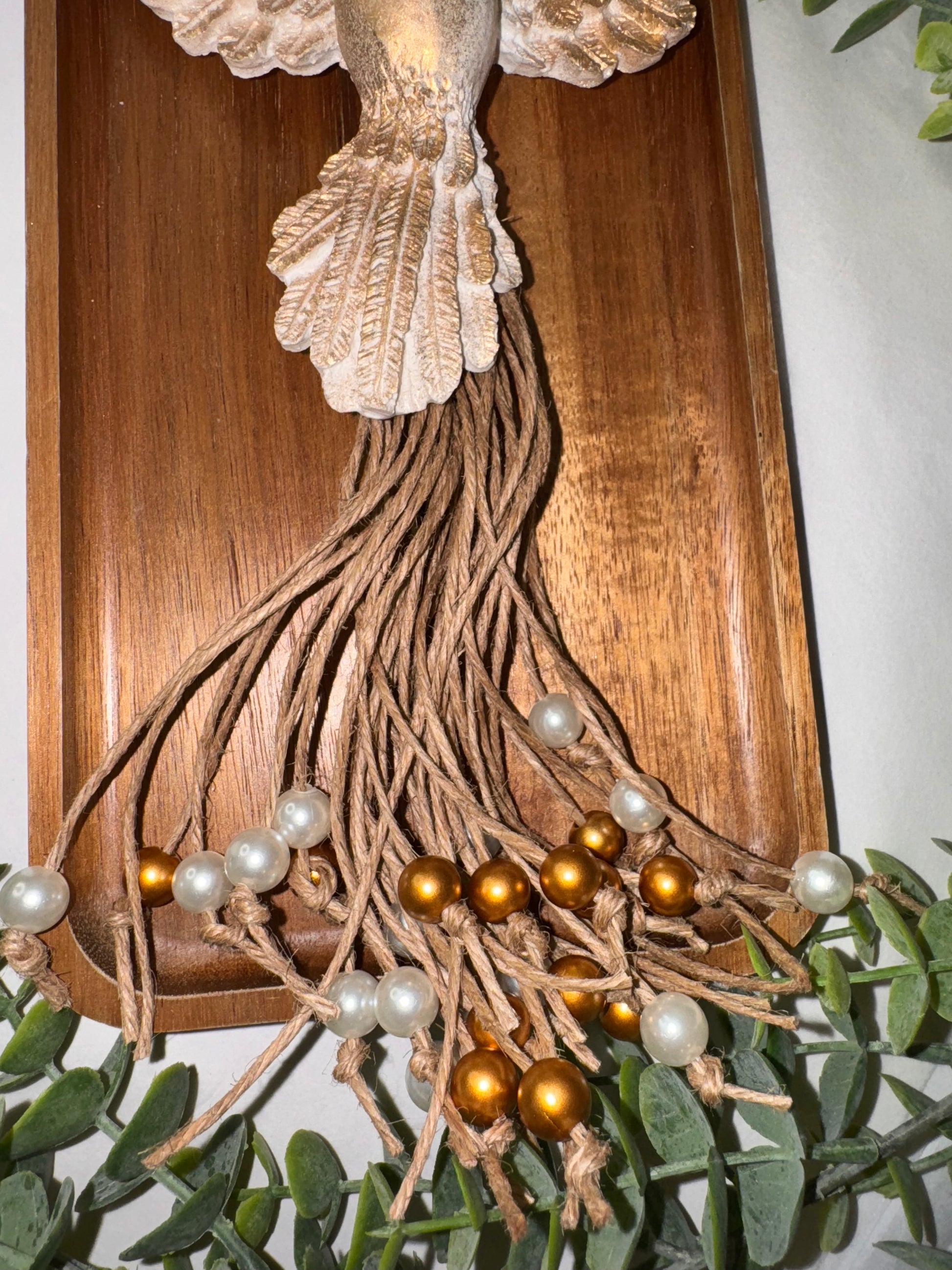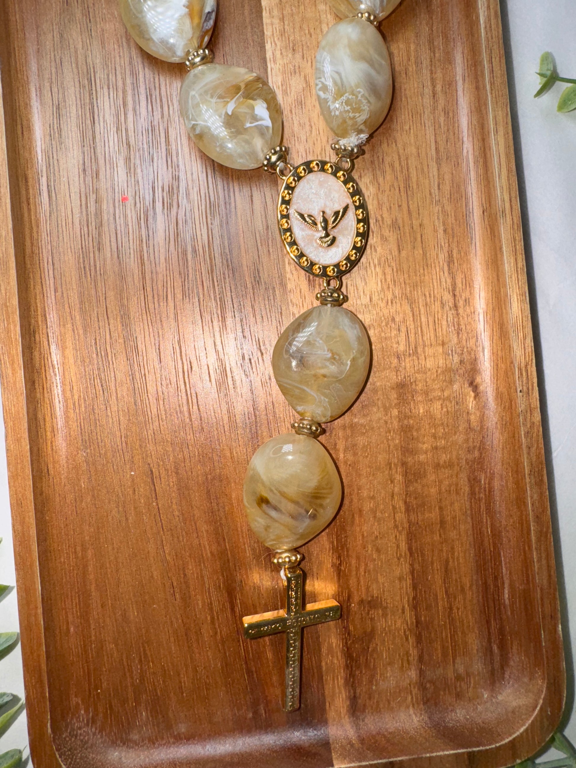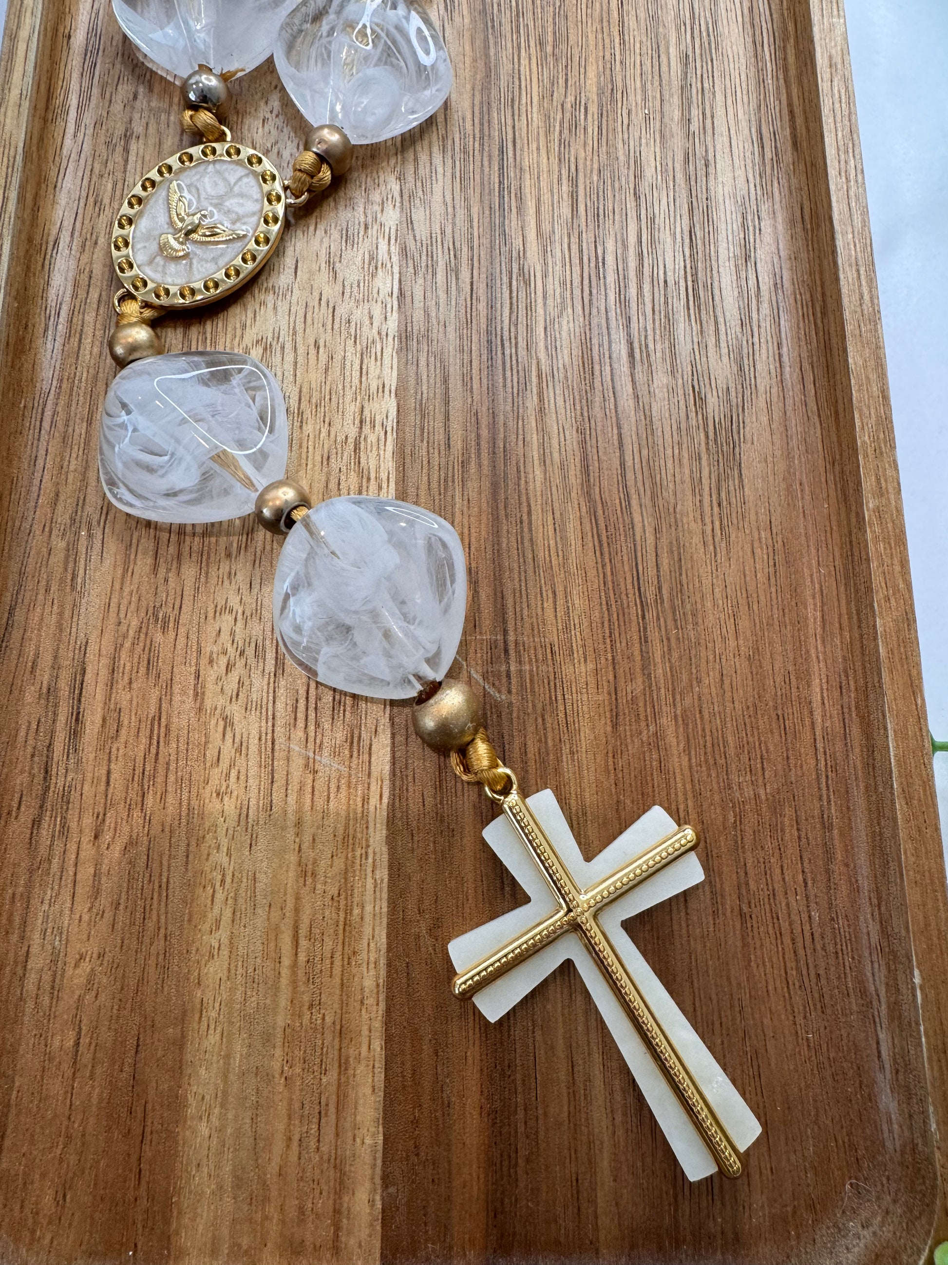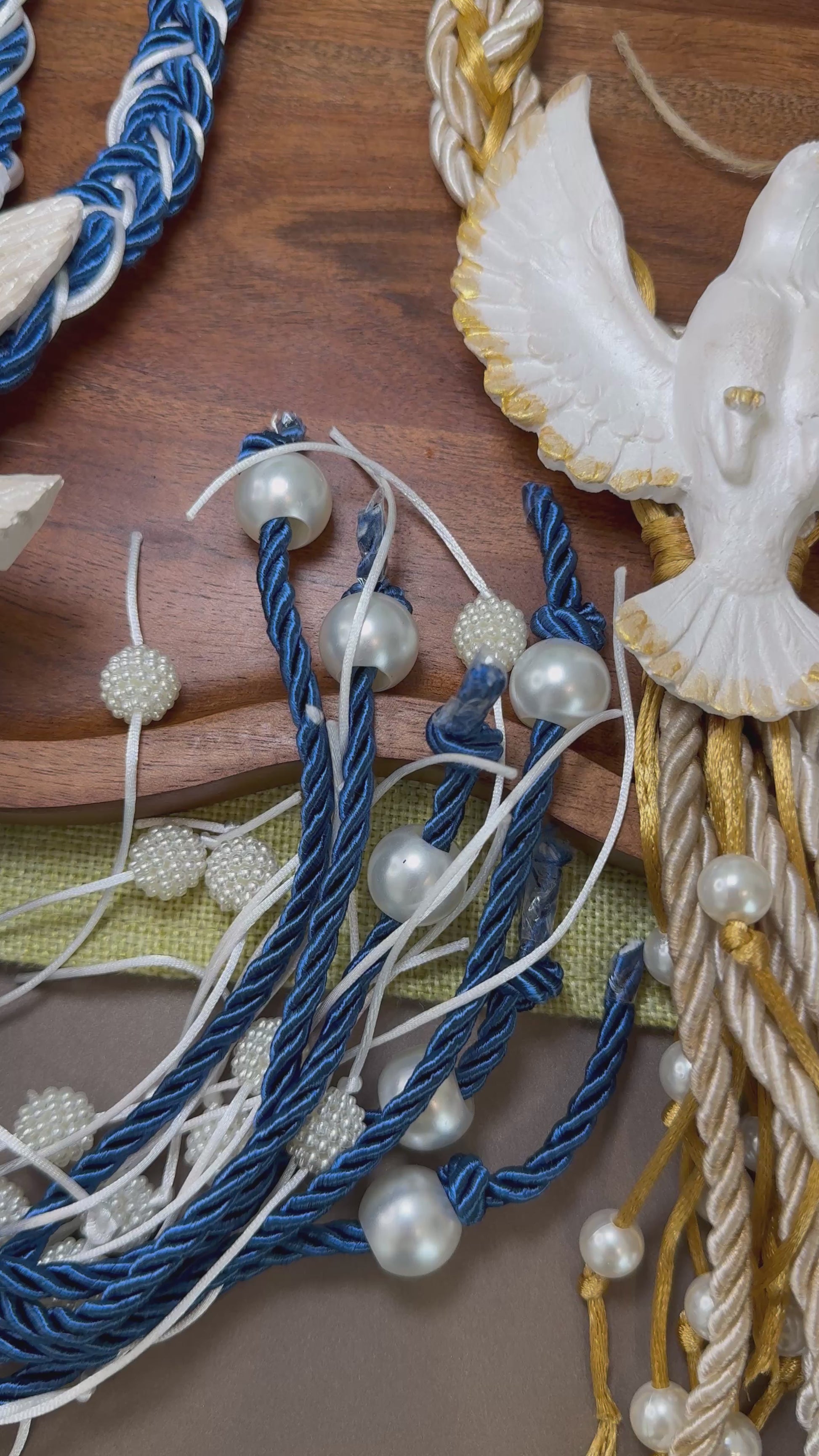 A symbol of faith and devotion, this Holy Spirit table necklace is a unique handcrafted piece that brings beauty and spirituality to your home. Made from premium materials such as ceramic, wood, resin, or plated metals, each model features unique details and color combinations such as blue, white, terracotta, gold, and pearl.