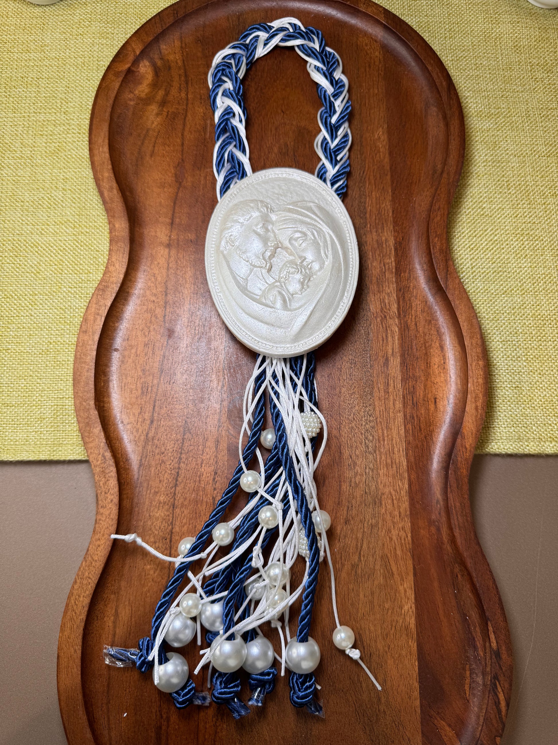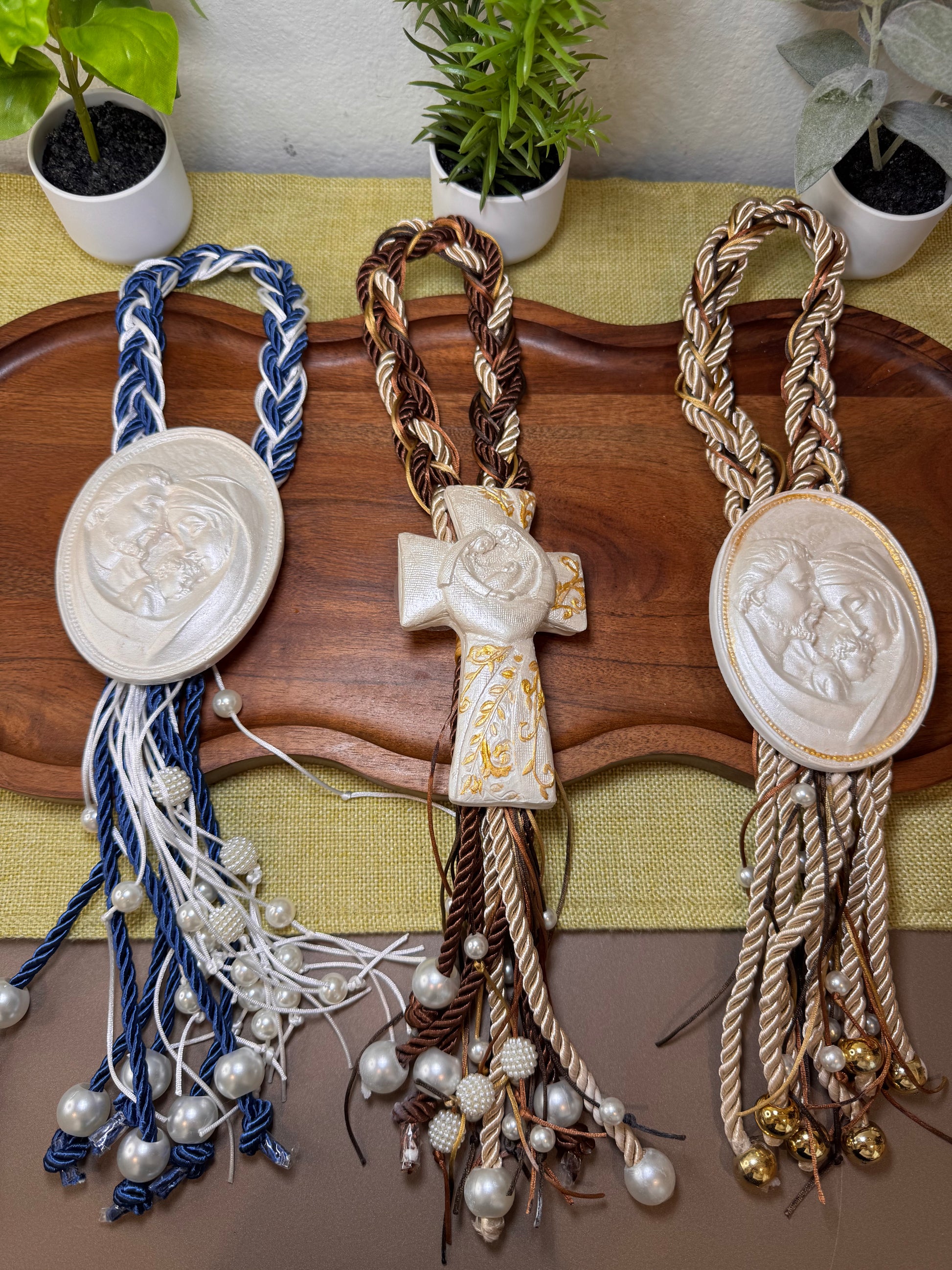 Bring the blessing and protection of the Holy Family into your home with this beautiful Decorative Table Necklace. Each piece is handmade, with sophisticated details that combine tradition, faith and elegance.
