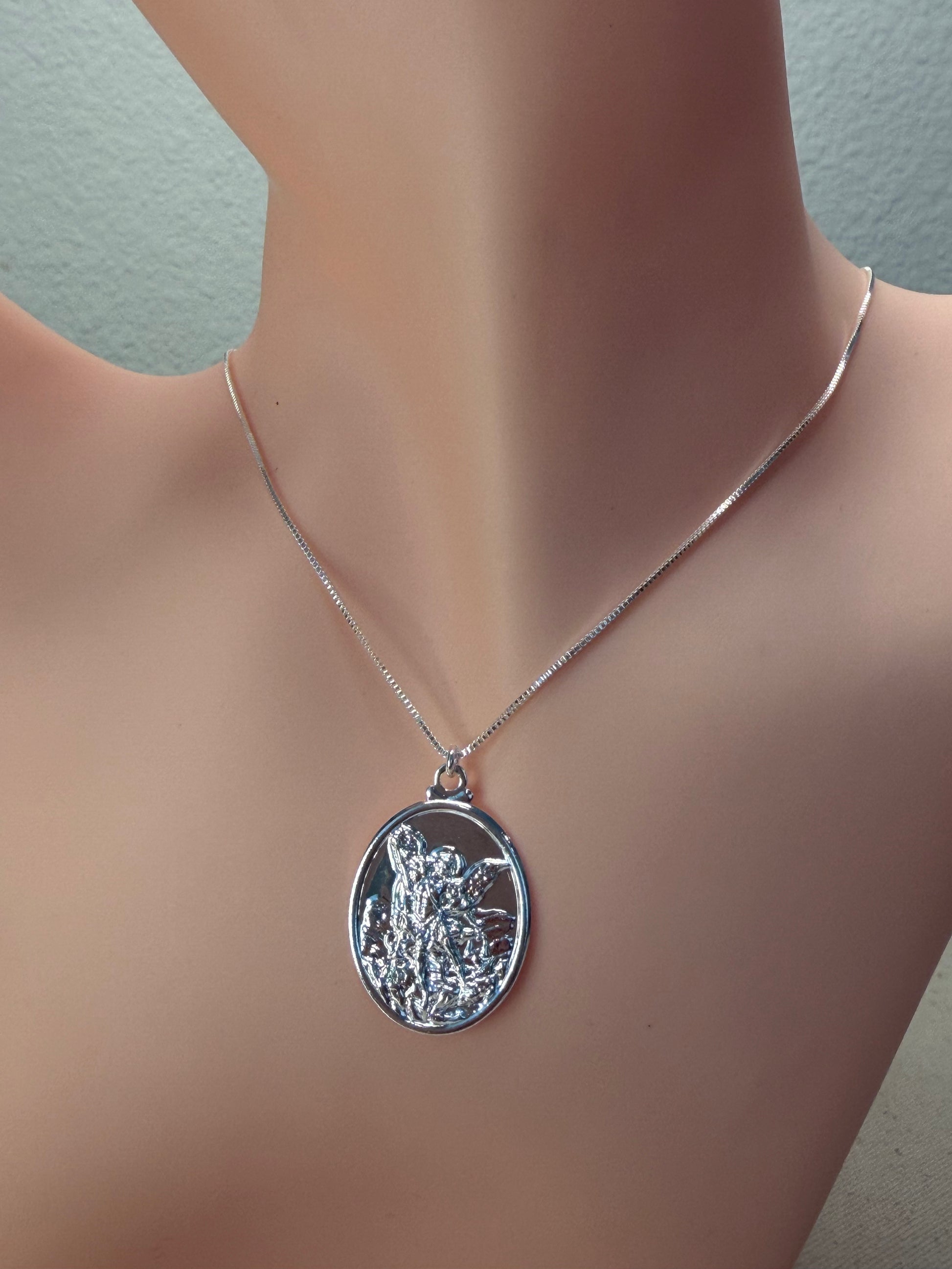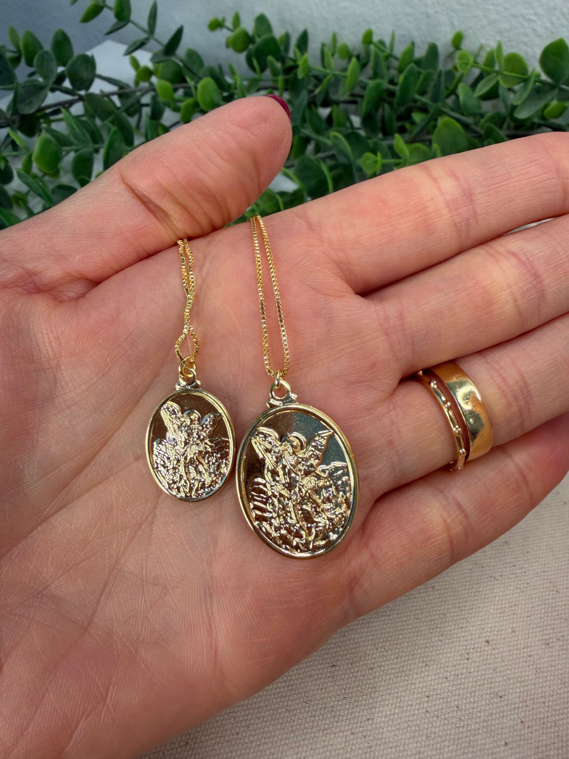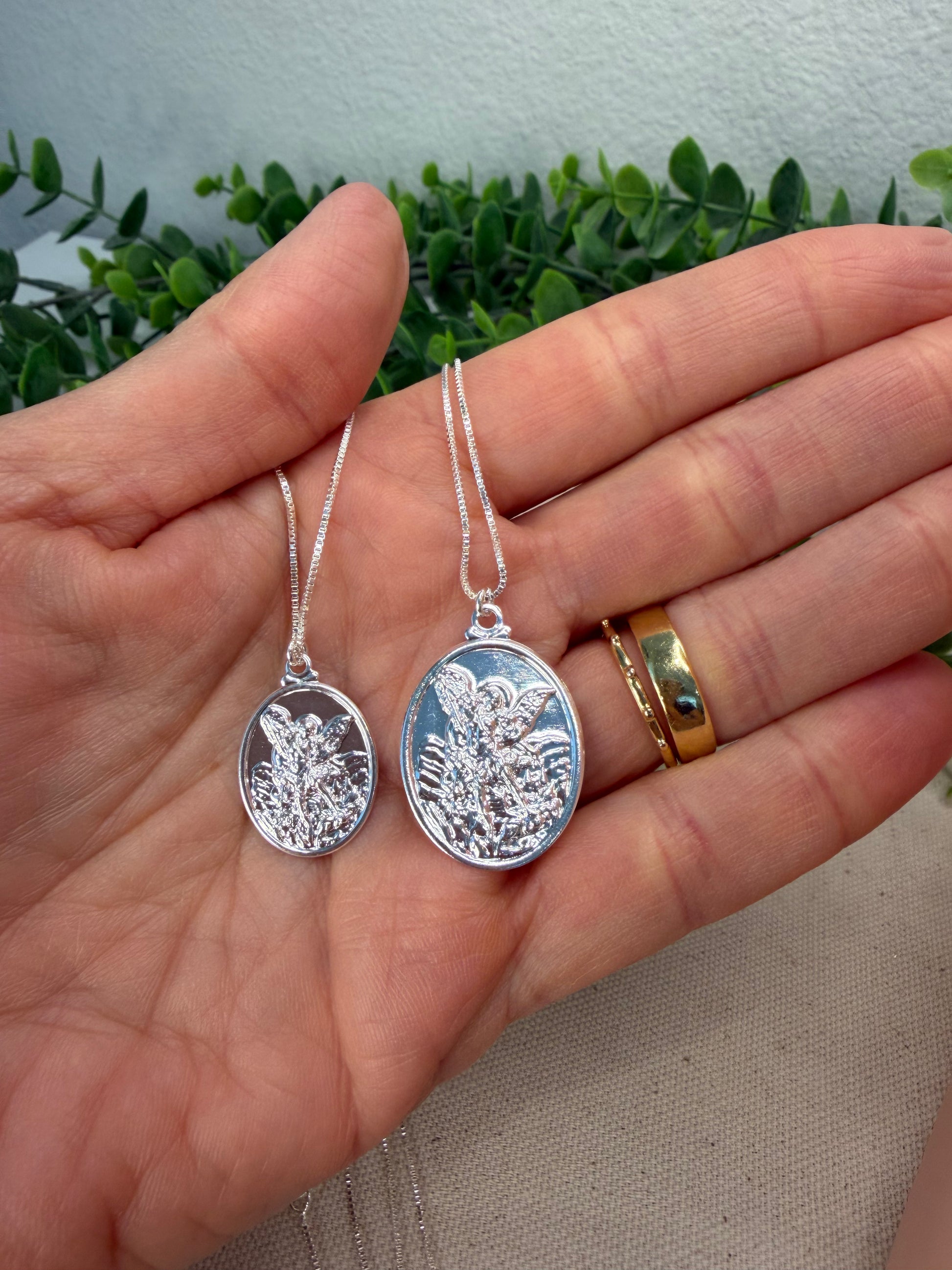 O pingente, com a imagem detalhada de São Miguel vencendo o dragão, está disponível em dois tamanhos — médio e grande — e acompanha uma corrente delicada de 45 cm.