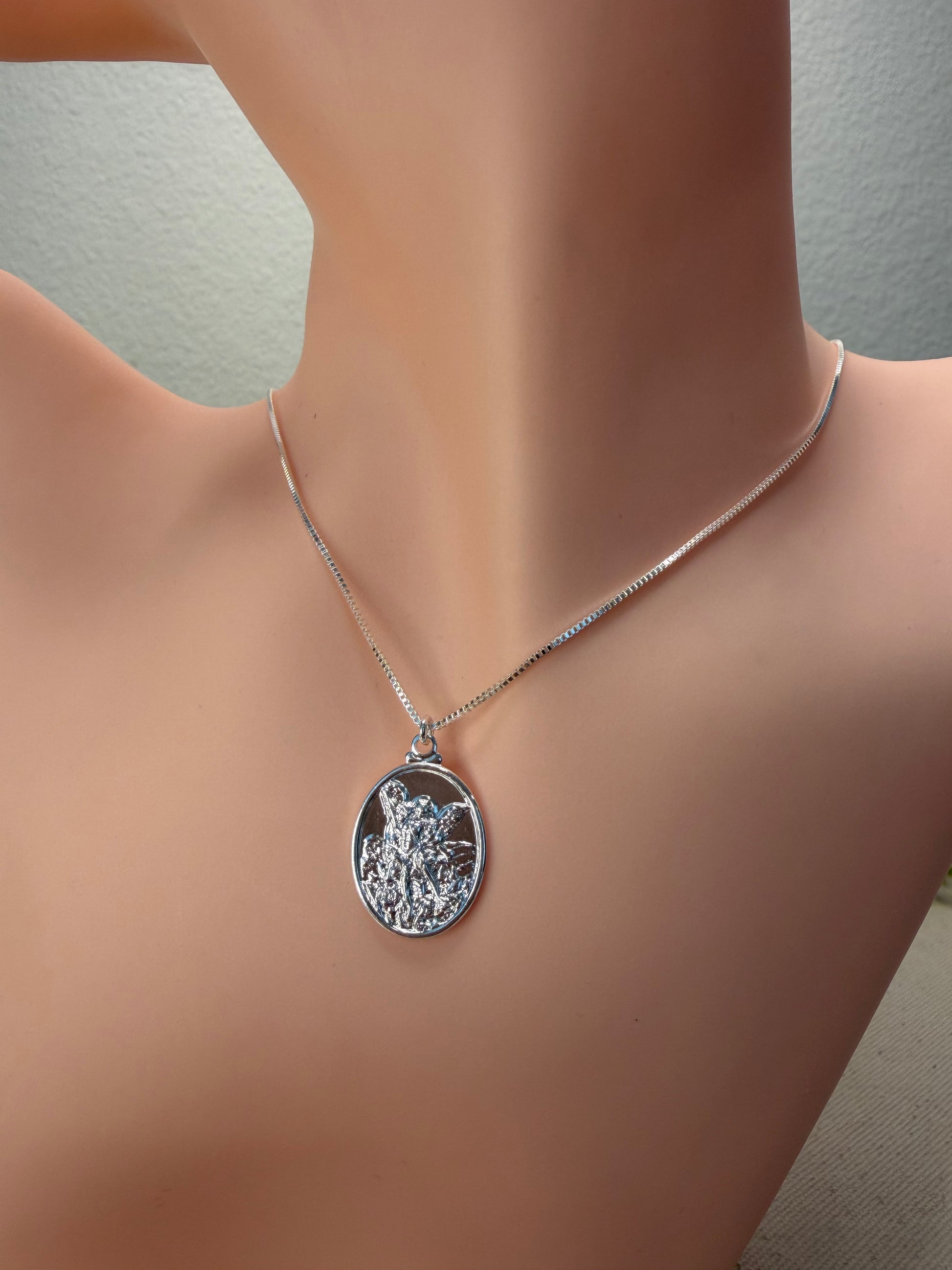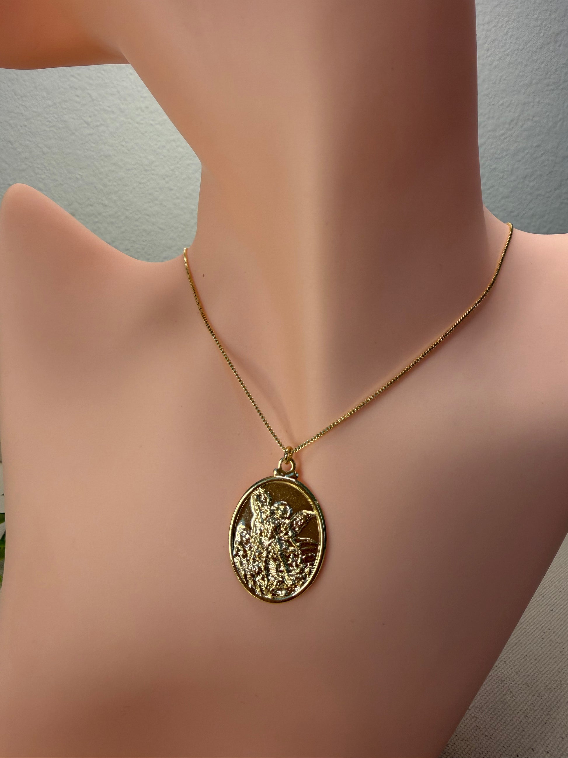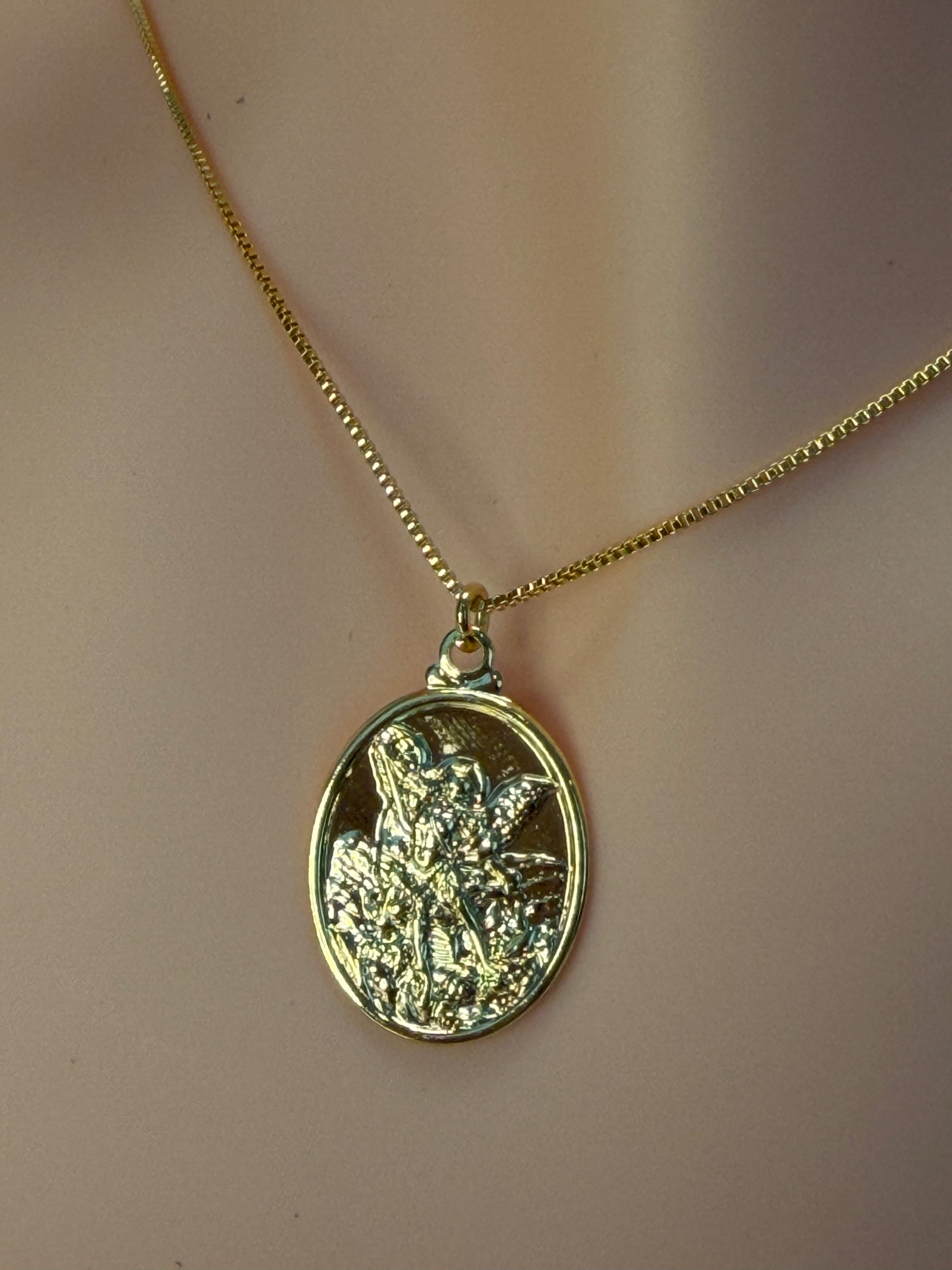 O pingente, com a imagem detalhada de São Miguel vencendo o dragão, está disponível em dois tamanhos — médio e grande — e acompanha uma corrente delicada de 45 cm.