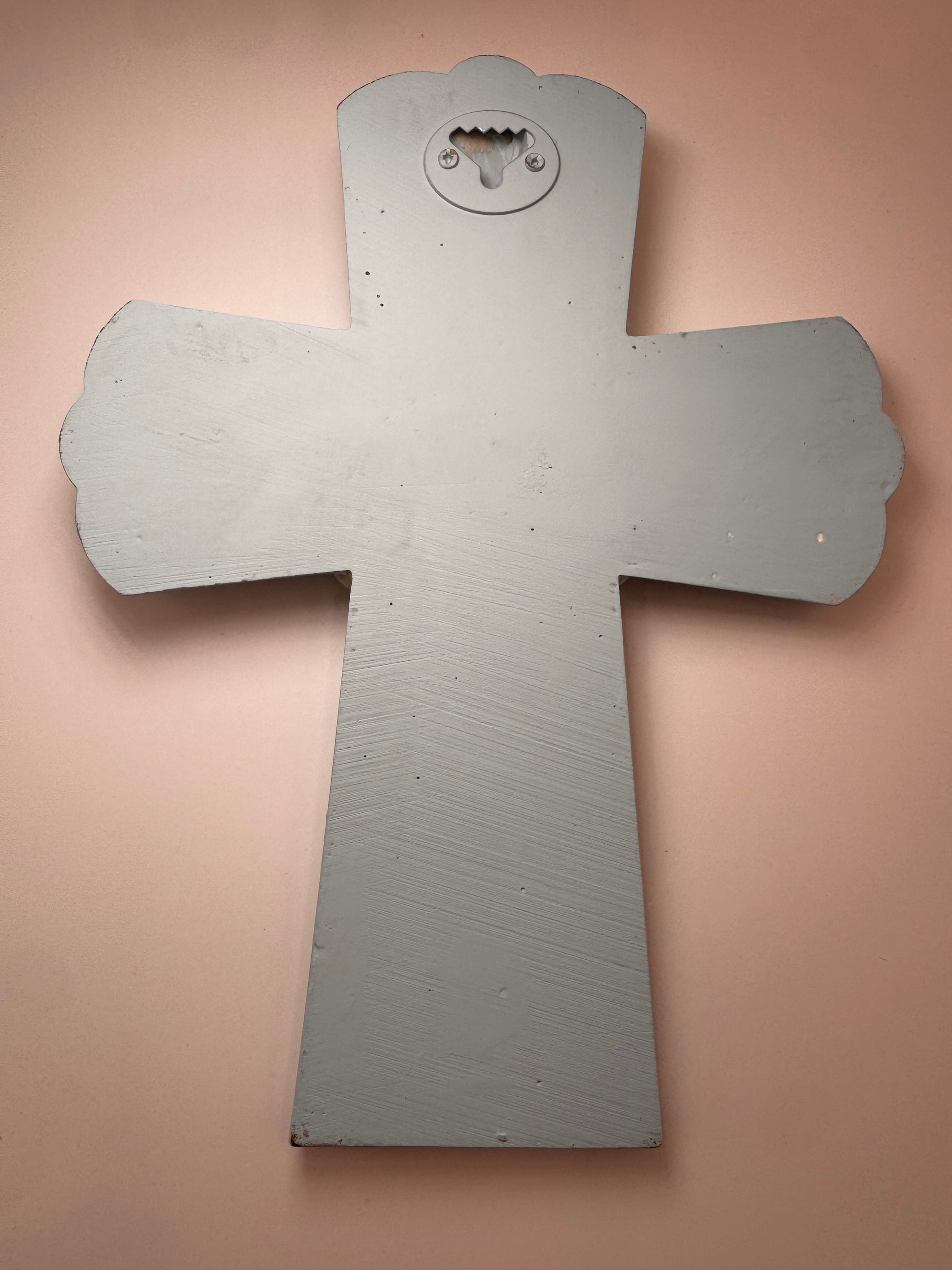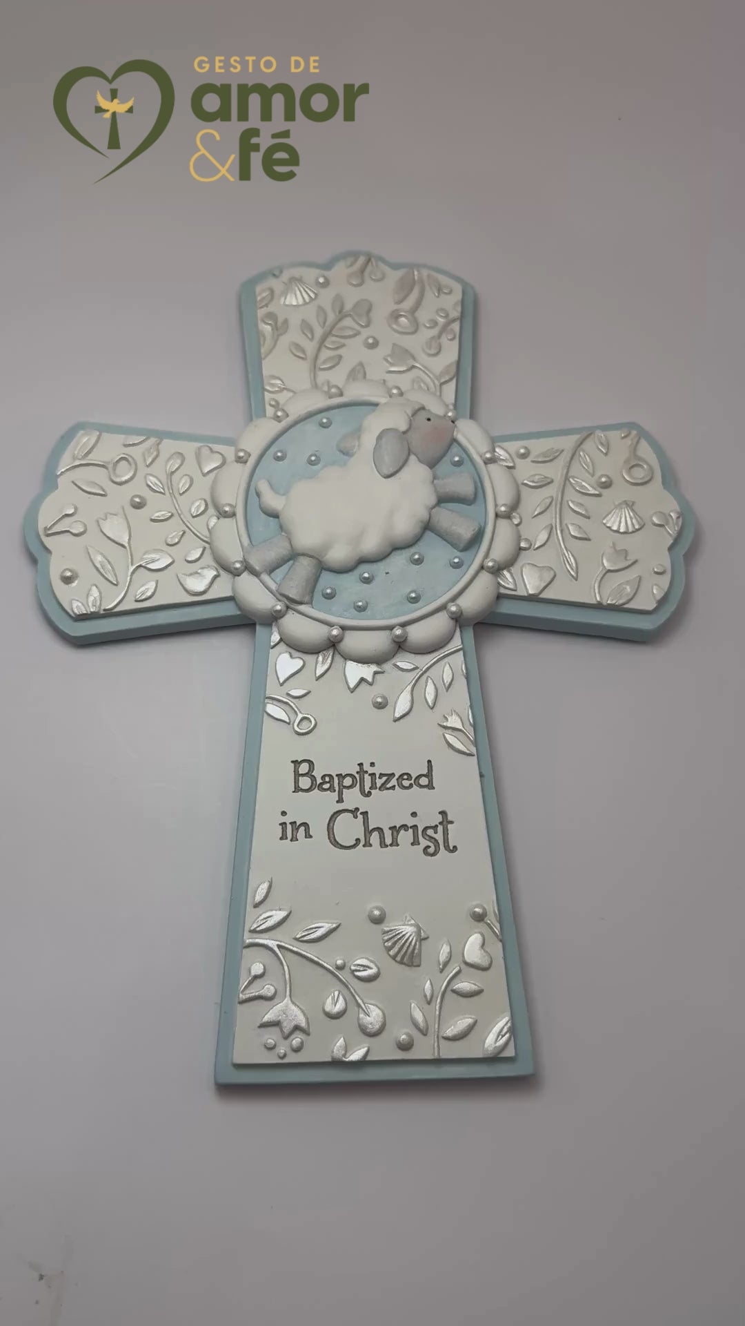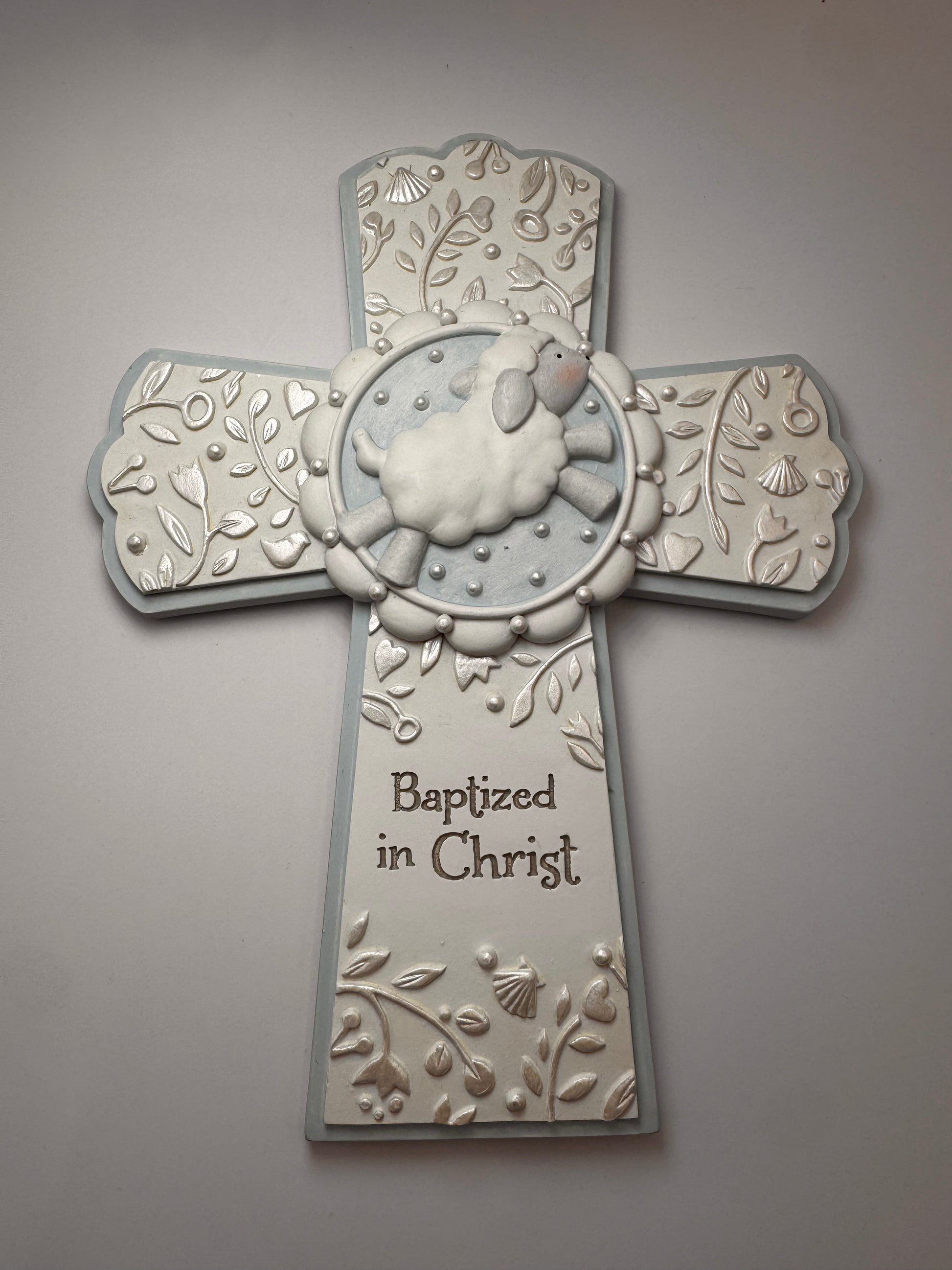 Made of polyresin, the crucifix features the image of a cute little sheep and the inscription "Baptized in Christ", symbolizing the blessings of baptism. It has a keyhole on the back to make it easy to hang on the wall of the baby's room.