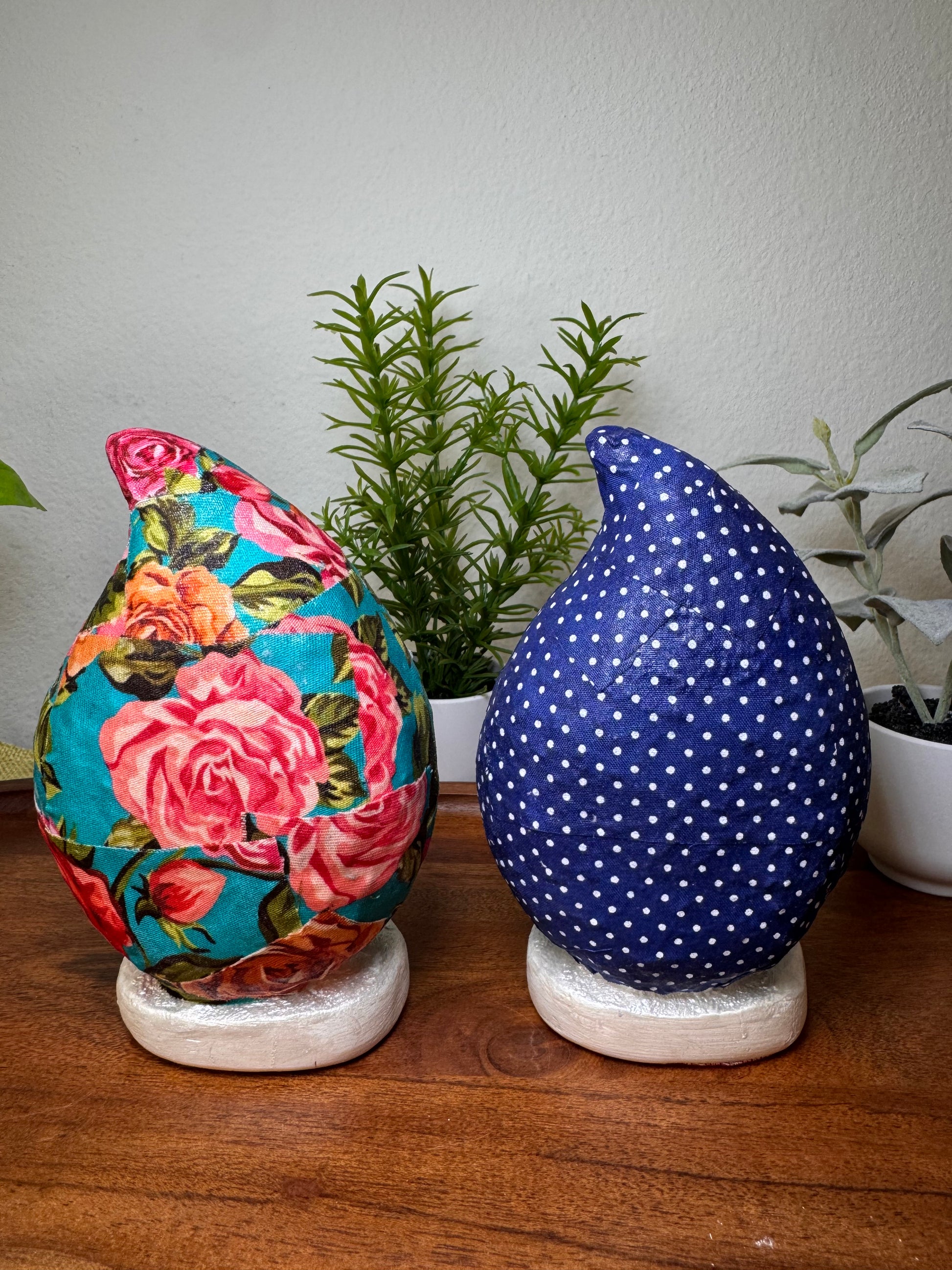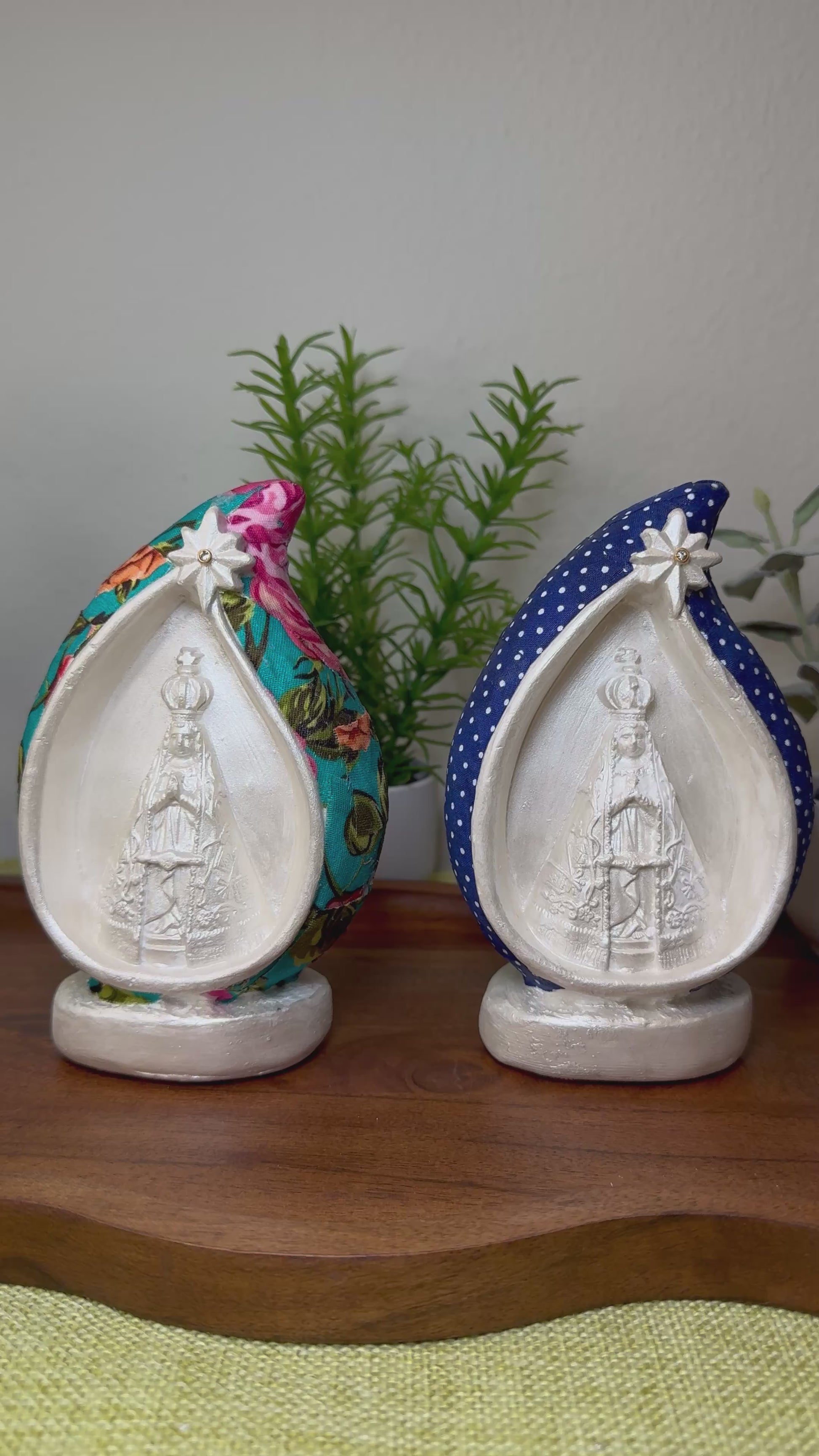Plaster statue of Our Lady of Aparecida , 13 cm tall, delicately inserted inside a drop that symbolizes protection and faith. The statue is wrapped in an external finish made of fabric, offering two charming options: a soft floral and a blue with white polka dots , bringing a playful and welcoming touch to the piece. The pearlescent paint gives it a soft and elegant shine, highlighting the beauty and serenity of Our Lady of Aparecida. Perfect for decorating with grace and devotion, this piece brings a special meaning to any environment.
