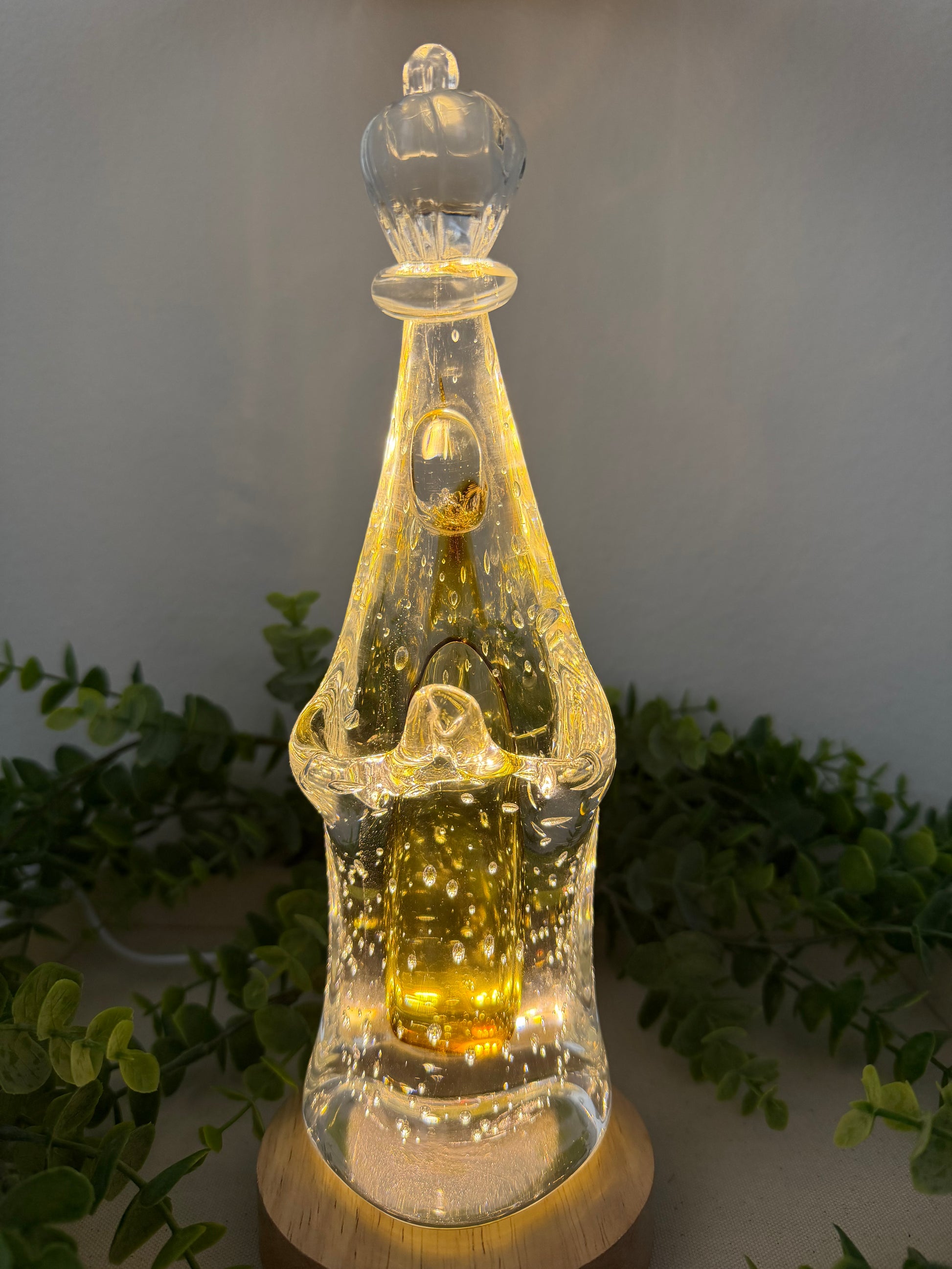 Handcrafted by Brazilian artisans specializing in Murano crystal , this representation of Our Lady of Fátima has a beautiful golden amber tone on the body of the image, surrounded by translucent crystal glass with a decorative internal bubble effect, creating an enchanting glow — especially under lighting.