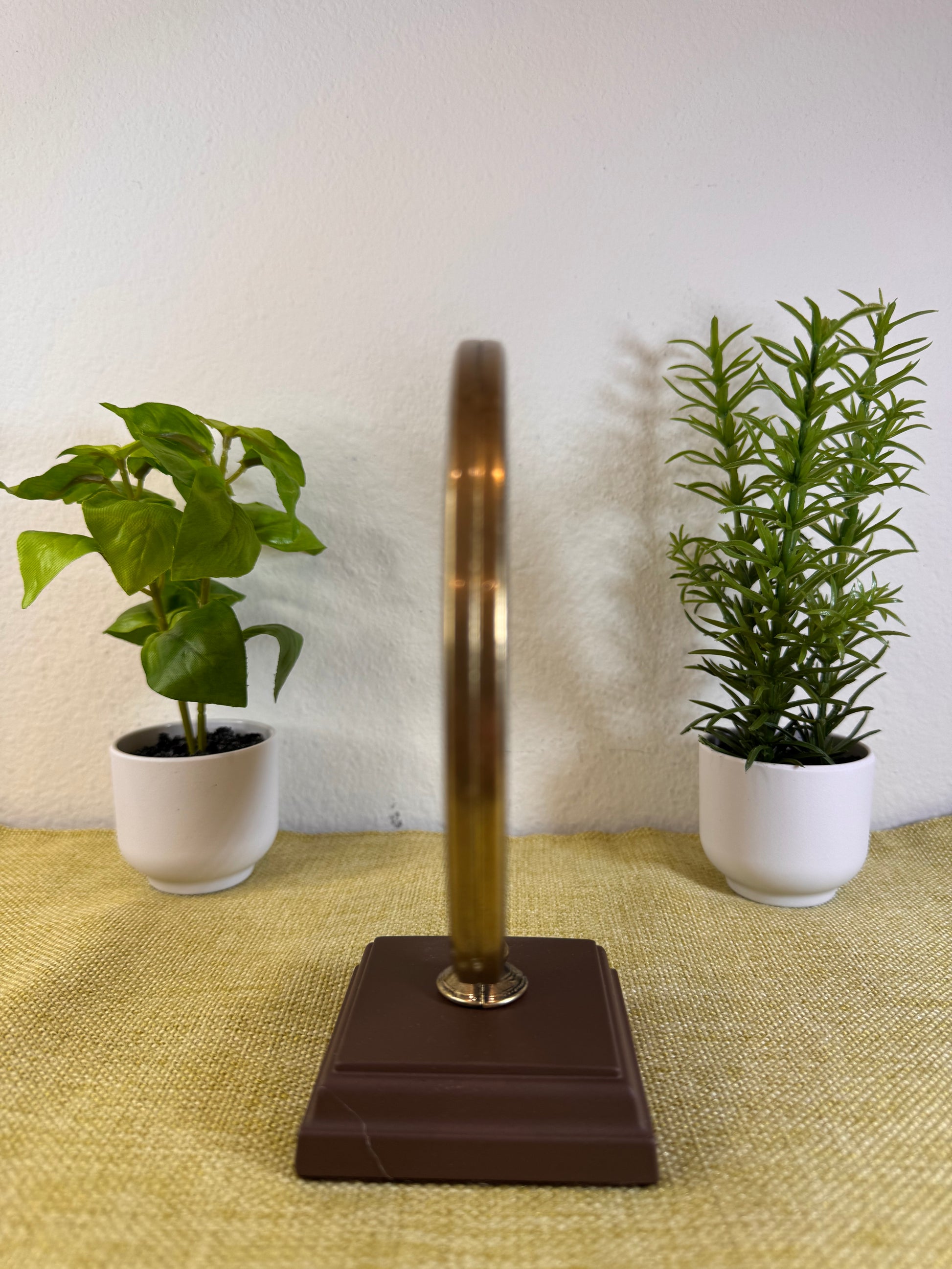 Made of high-quality metal with a wooden base and an old gold finish, the ornament features refined artistic detailing and a design that combines classic and modern, without losing its sacred essence.