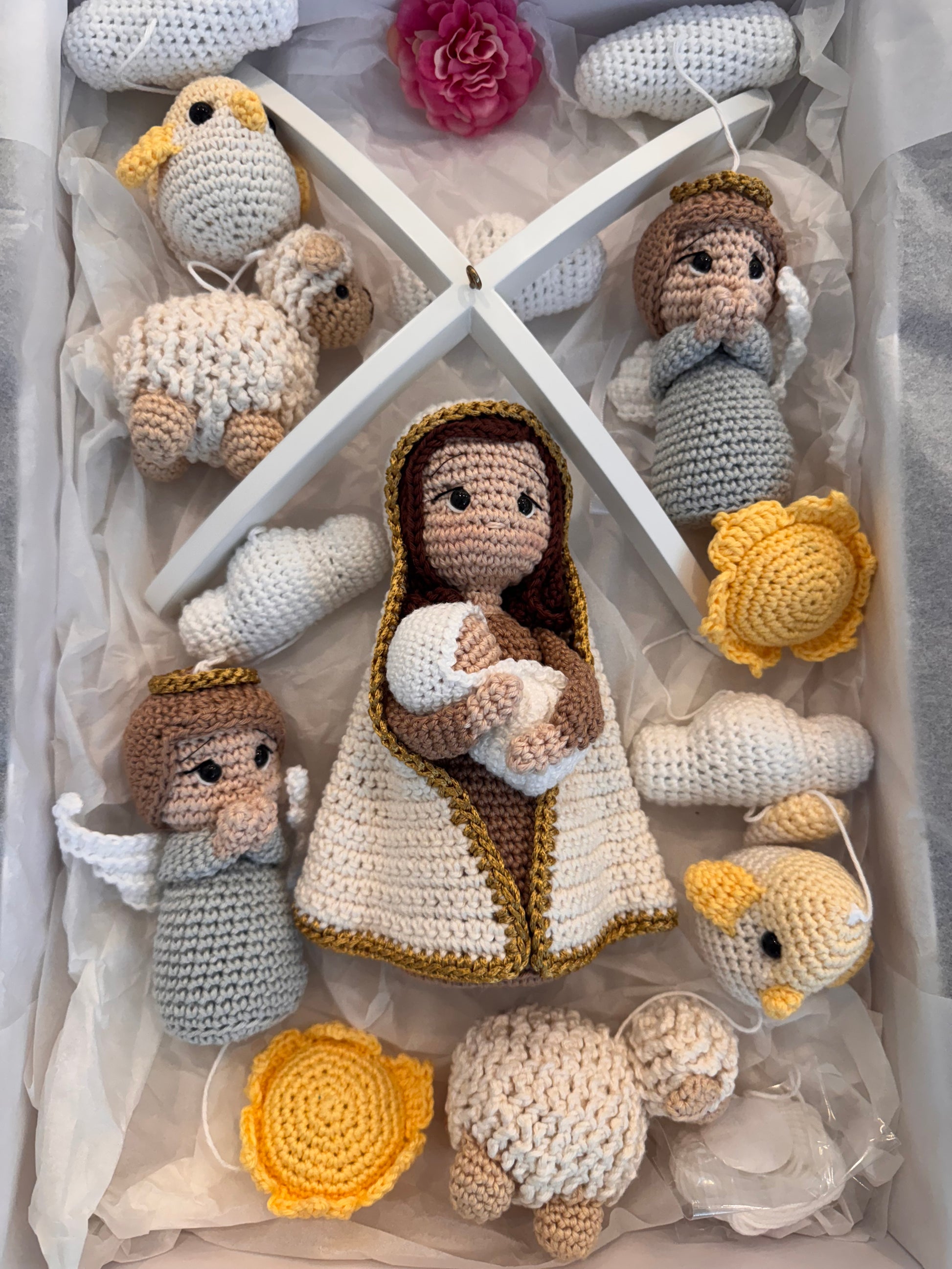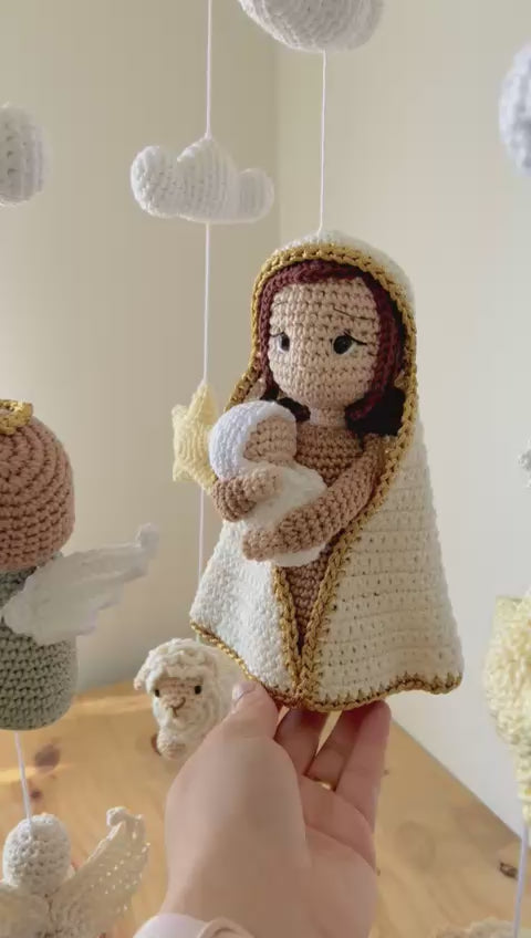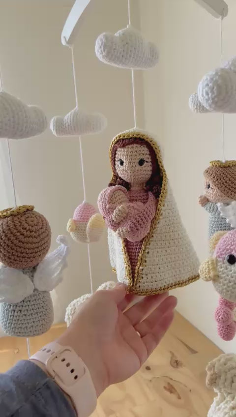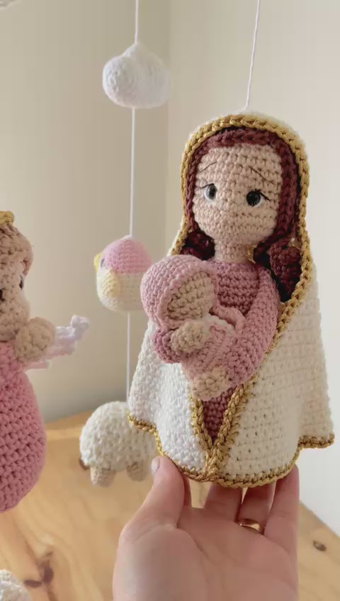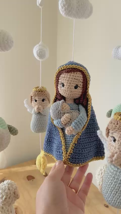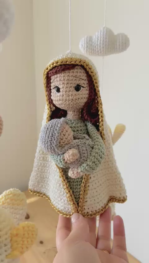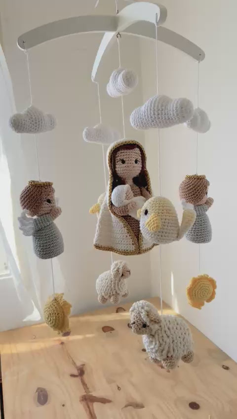 A true handmade treasure! Every detail of this mobile was carefully crocheted using the amigurumi technique , featuring little animals, angels, and a delicate image of Our Lady holding the Baby Jesus .