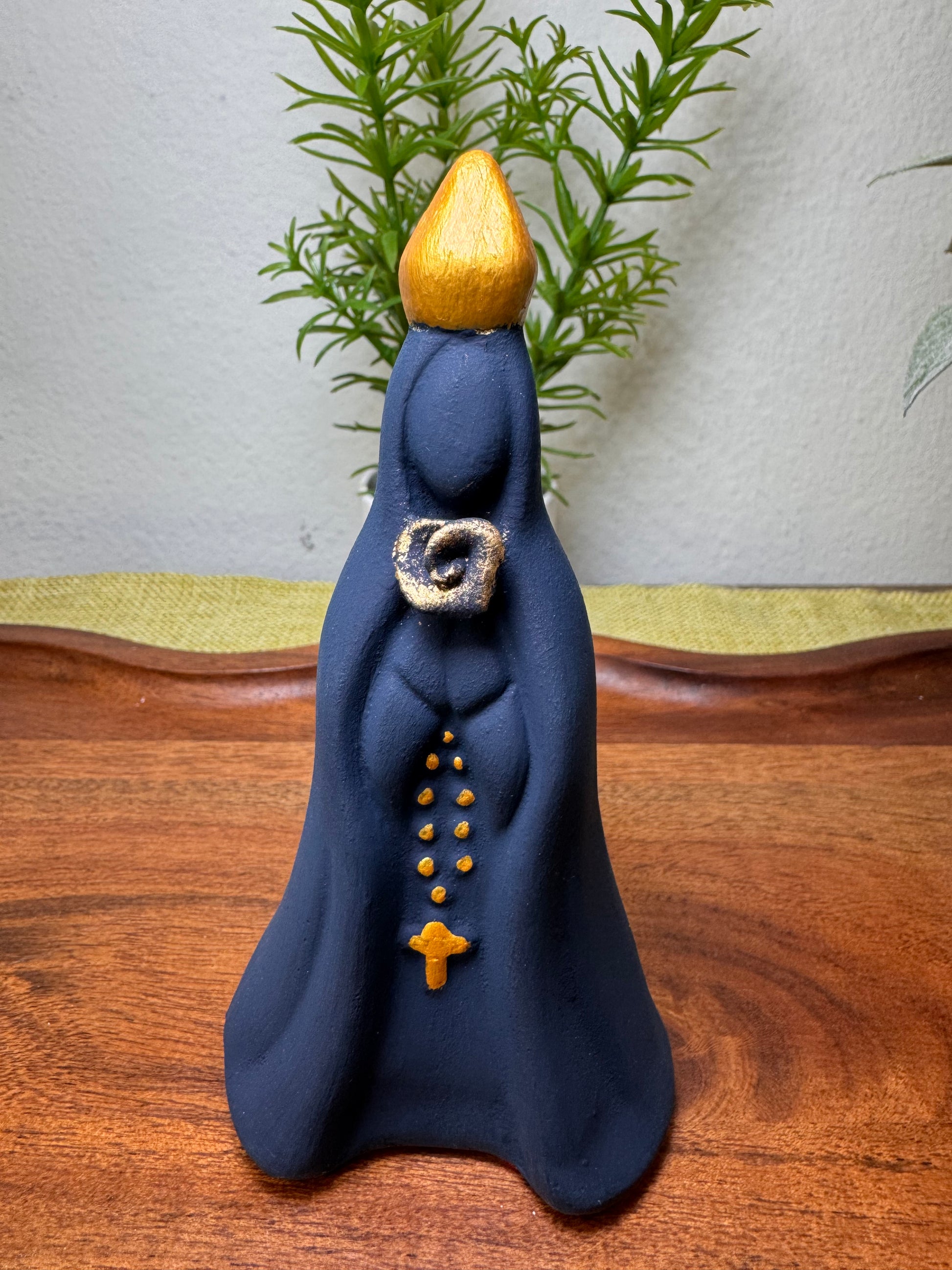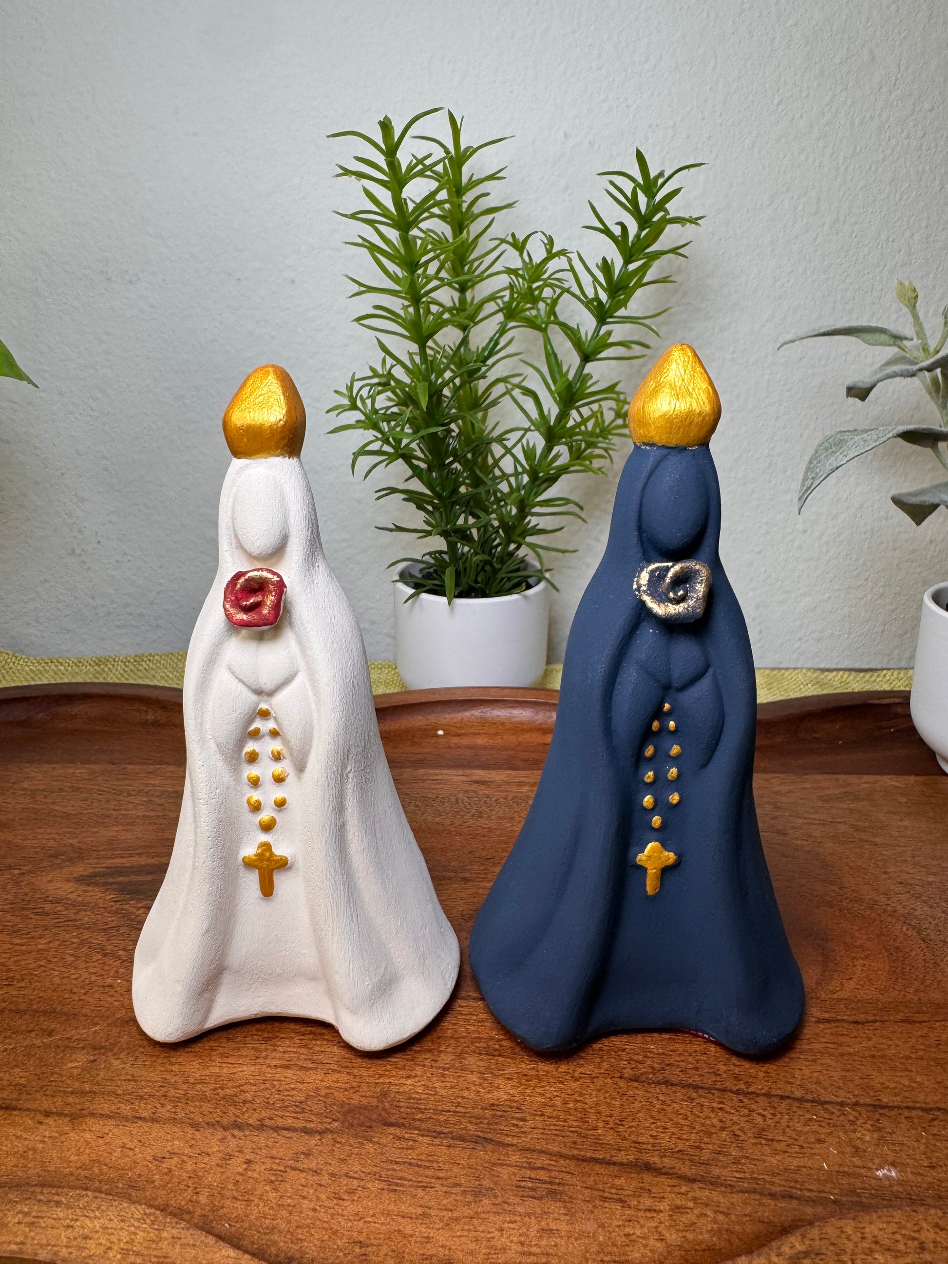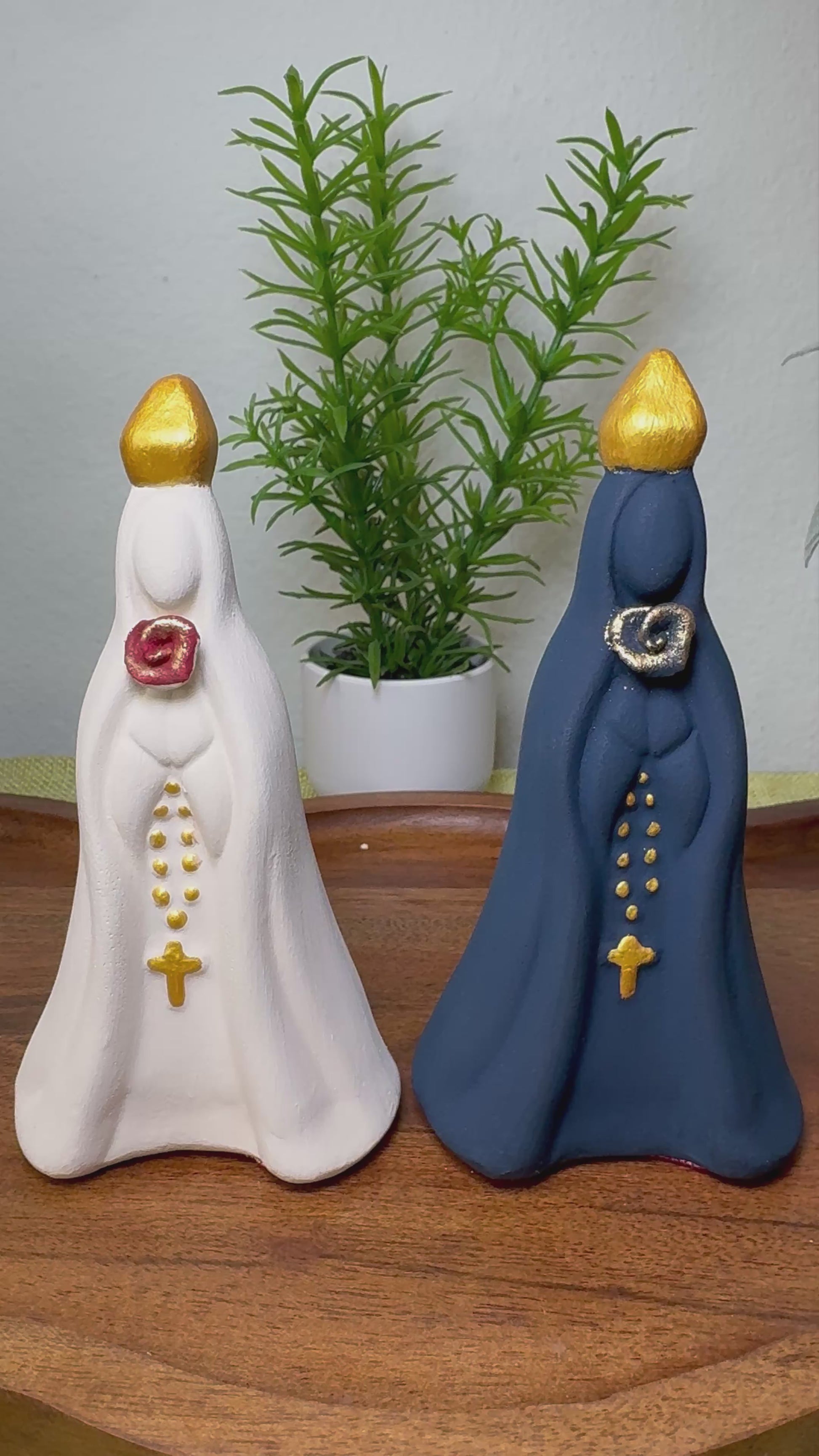 A 13 cm tall plaster statue of Our Lady of Beauty , perfect for adding a touch of devotion and beauty to any space. The piece is available in two color versions: sand , which gives it a soft and serene appearance, and blue , which conveys calm and peace. The delicate red detail on the rose symbolizes love and purity, while the hand-painted golden crown adds a touch of nobility and respect to the image. Ideal for gifting or decorating, this work of art is a charming piece full of meaning.
