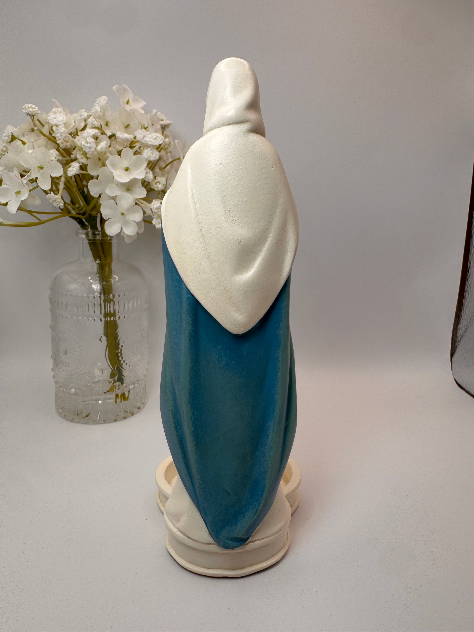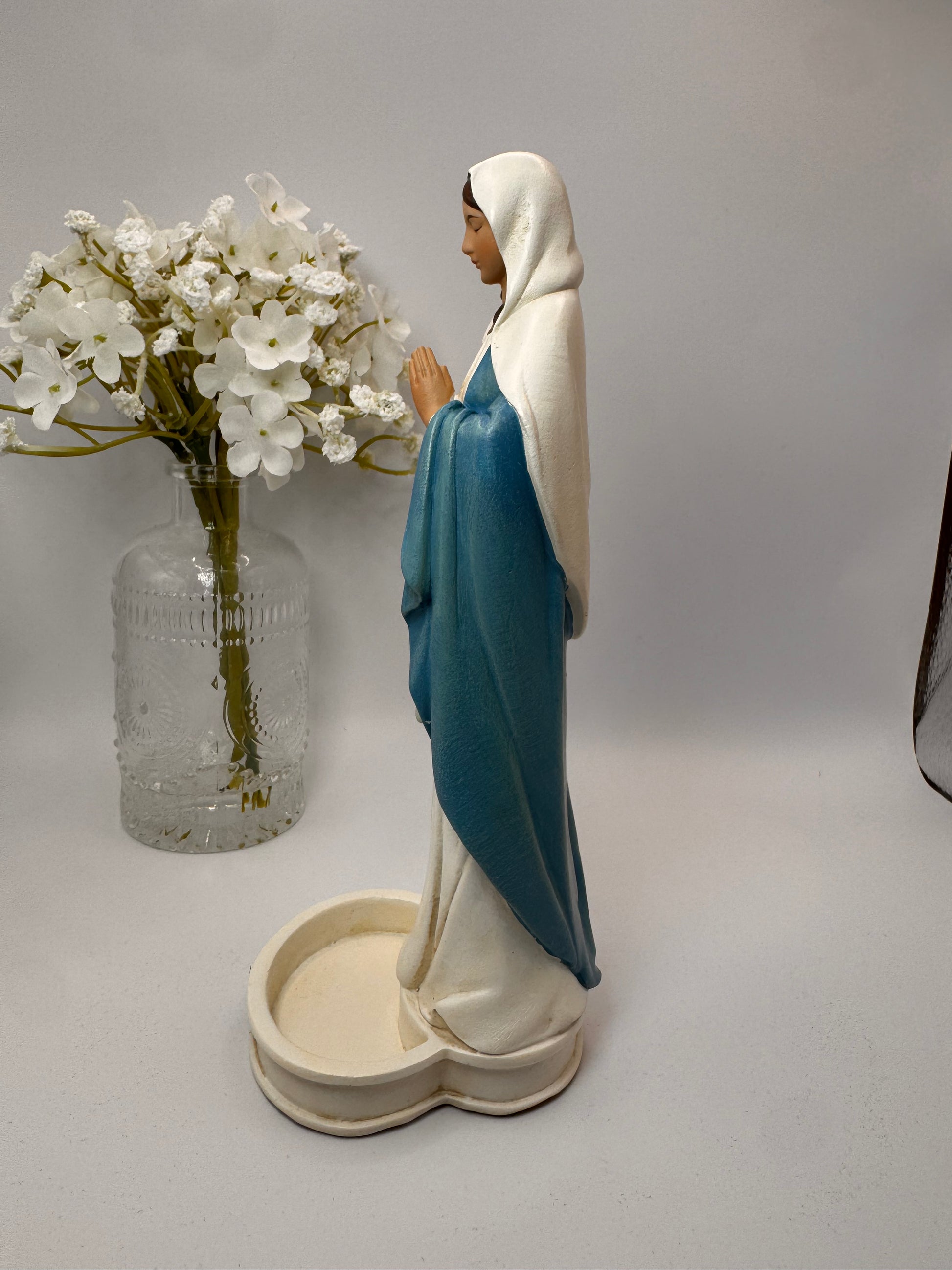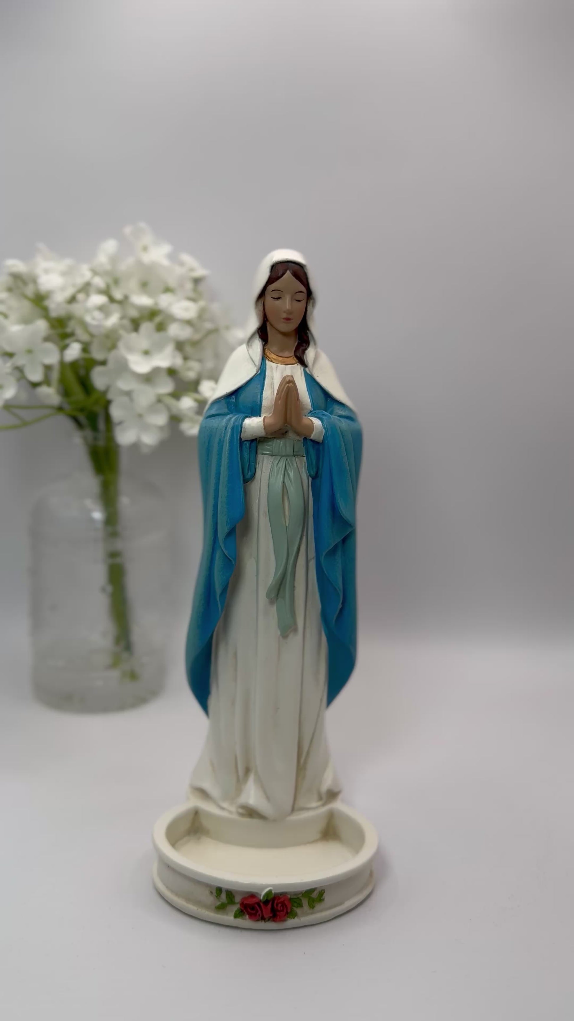 This delicate Our Lady figurine, made of hand-painted resin, measures 8" tall and features a practical tray at the base to store your rosary with care and devotion.
