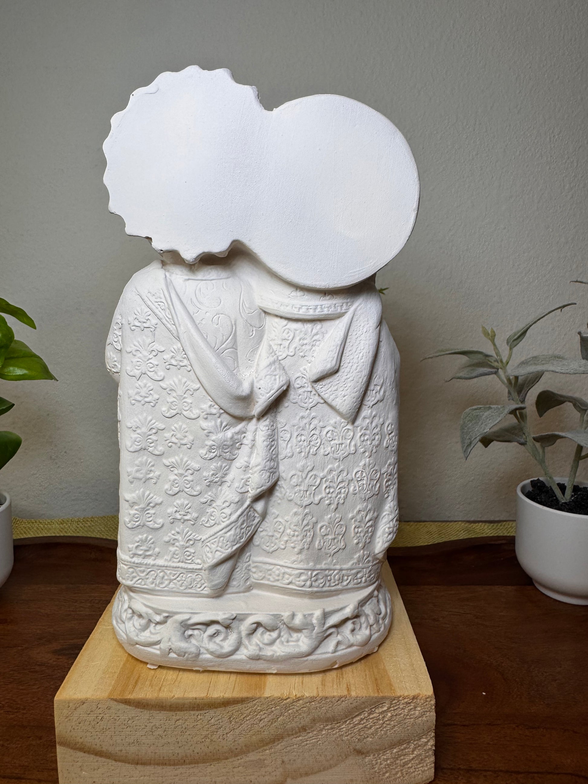 The wooden base adds a touch of elegance and stability to the piece, making it perfect for decorating any room with a deep meaning. The delicate image and soft details make this piece a beautiful representation of the Christian faith, ideal for those looking for a decoration full of love and spirituality.