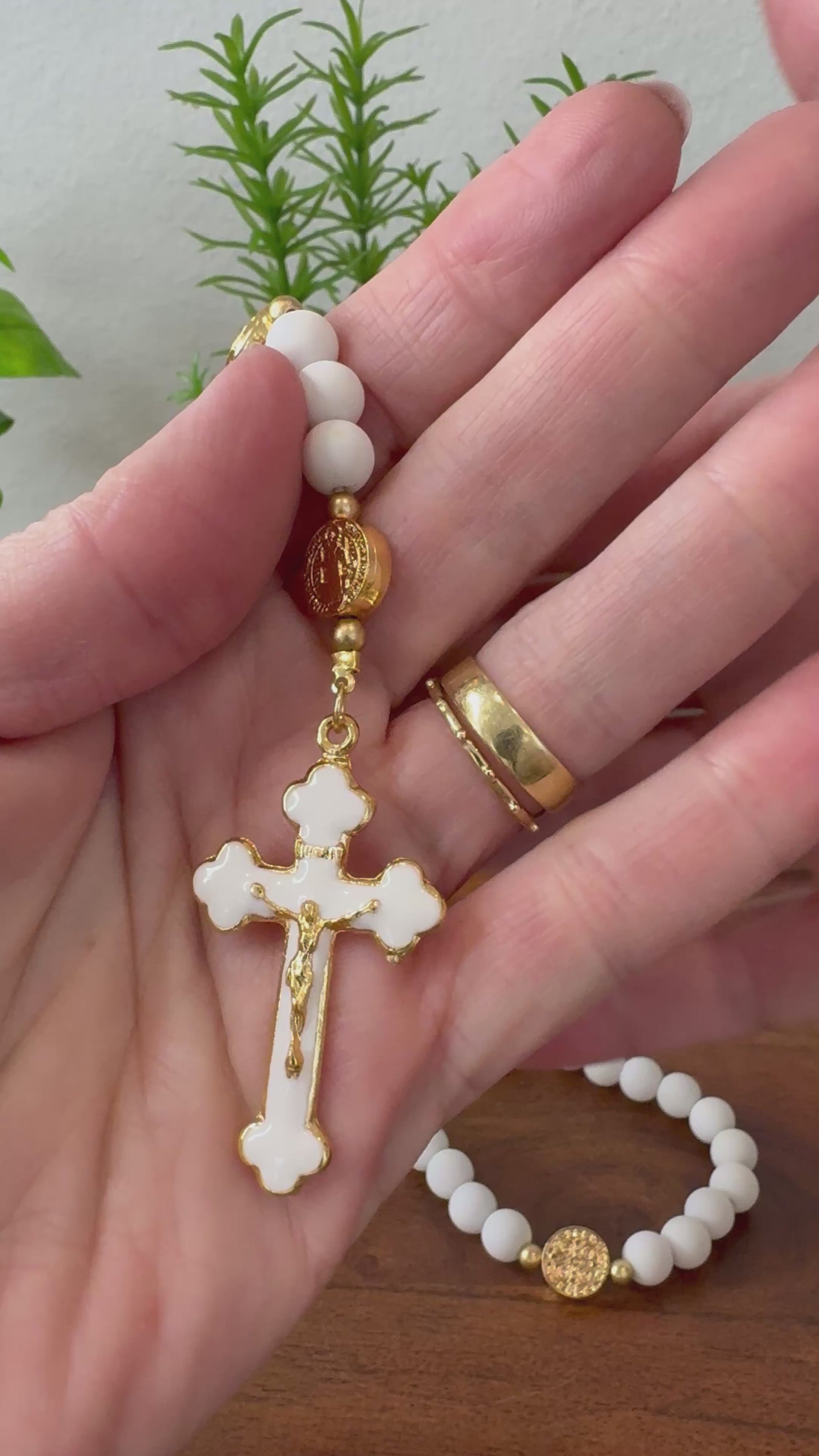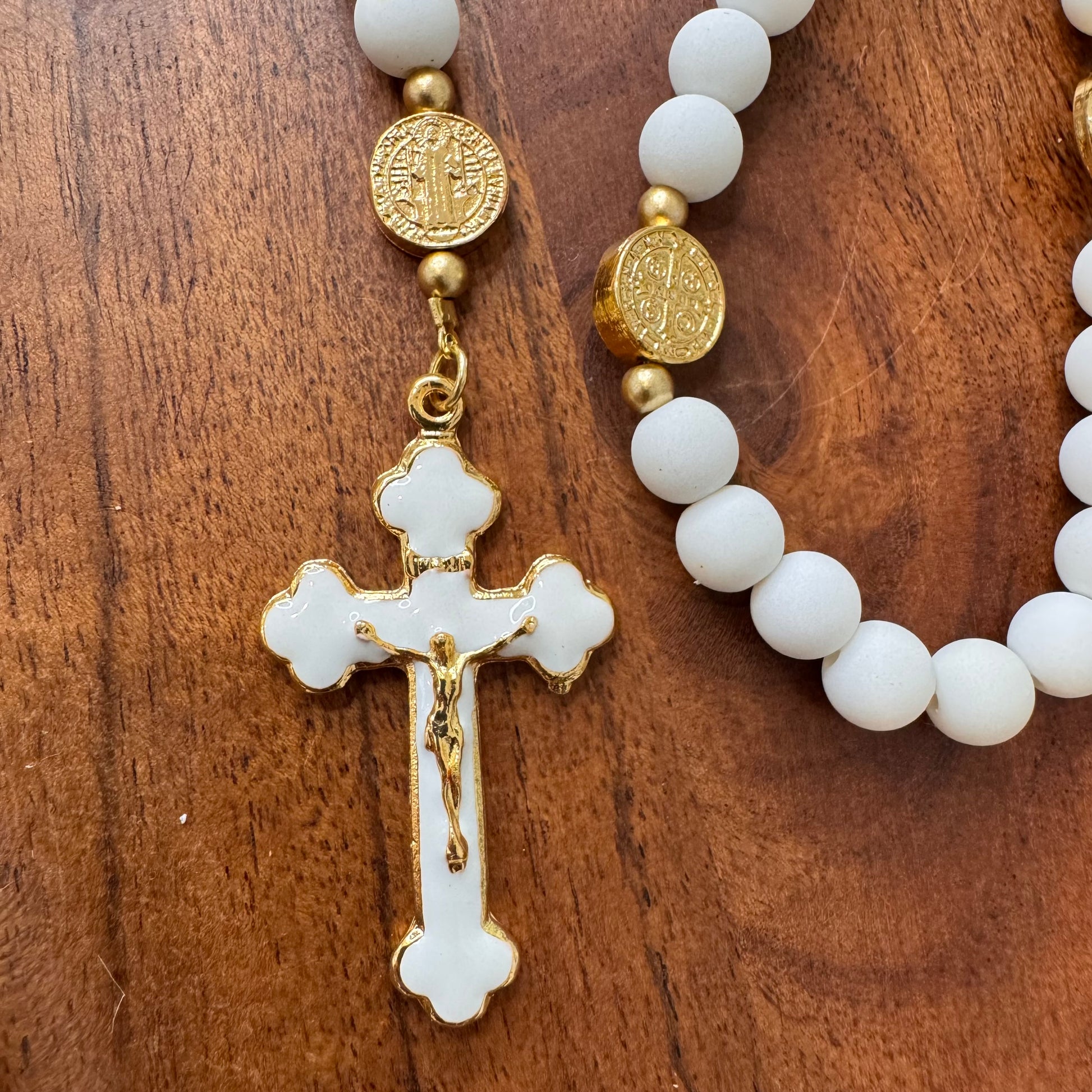 The white and gold Saint Benedict rosary is a devotional item that combines elegance and spirituality. With white beads, which symbolize purity, and gold details that reflect divine light, this rosary is a visual representation of protection and faith. The Saint Benedict medallion, which accompanies the rosary, is a powerful symbol of blessings and protection against evil, and is known for its history of miracles and graces. This rosary is ideal for moments of prayer, meditation and for those looking for a devotional object with a touch of sophistication.