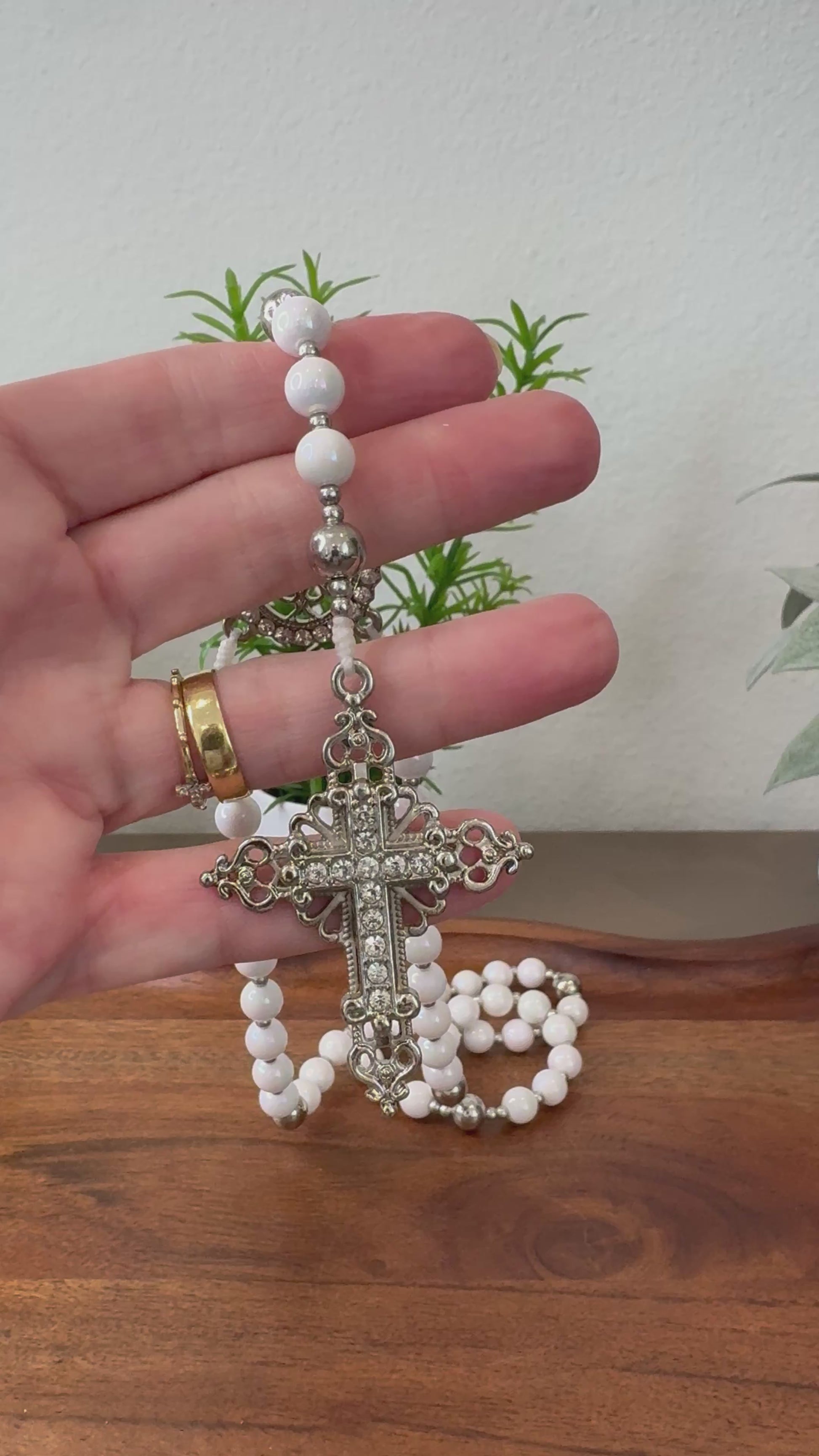 This Holy Spirit rosary is a unique piece, handcrafted with care and dedication. With delicate beads in shades of white and silver, it symbolizes purity and divine light. Each detail was carefully thought out to reflect the beauty of spirituality, creating harmony between the materials and the energy it transmits. Ideal for moments of prayer and devotion, this rosary is a true work of art, combining the elegance of silver with the serenity of white, promoting a deep connection with the Holy Spirit. Perfect for those looking for an object of faith that is also a beautiful accessory.