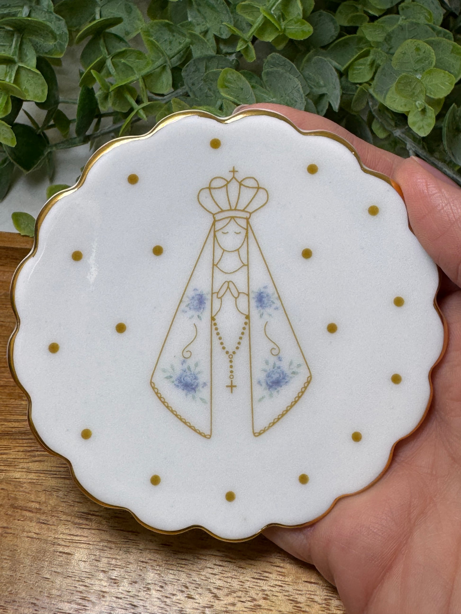 Platillo individual de 9,5 cm , con la imagen de Nuestra Señora Aparecida y una elegante franja dorada en el borde ✨, que aporta un toque especial de sofisticación.