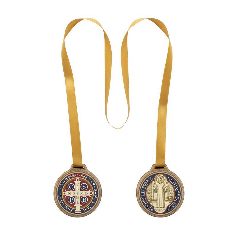 Composto por duas medalhas redondas em madeira maciça, unidas pela tradicional simbologia do escapulário, esta peça traz a Medalha de São Bento em alto-relevo nos dois lados, garantindo proteção contínua contra todo mal.