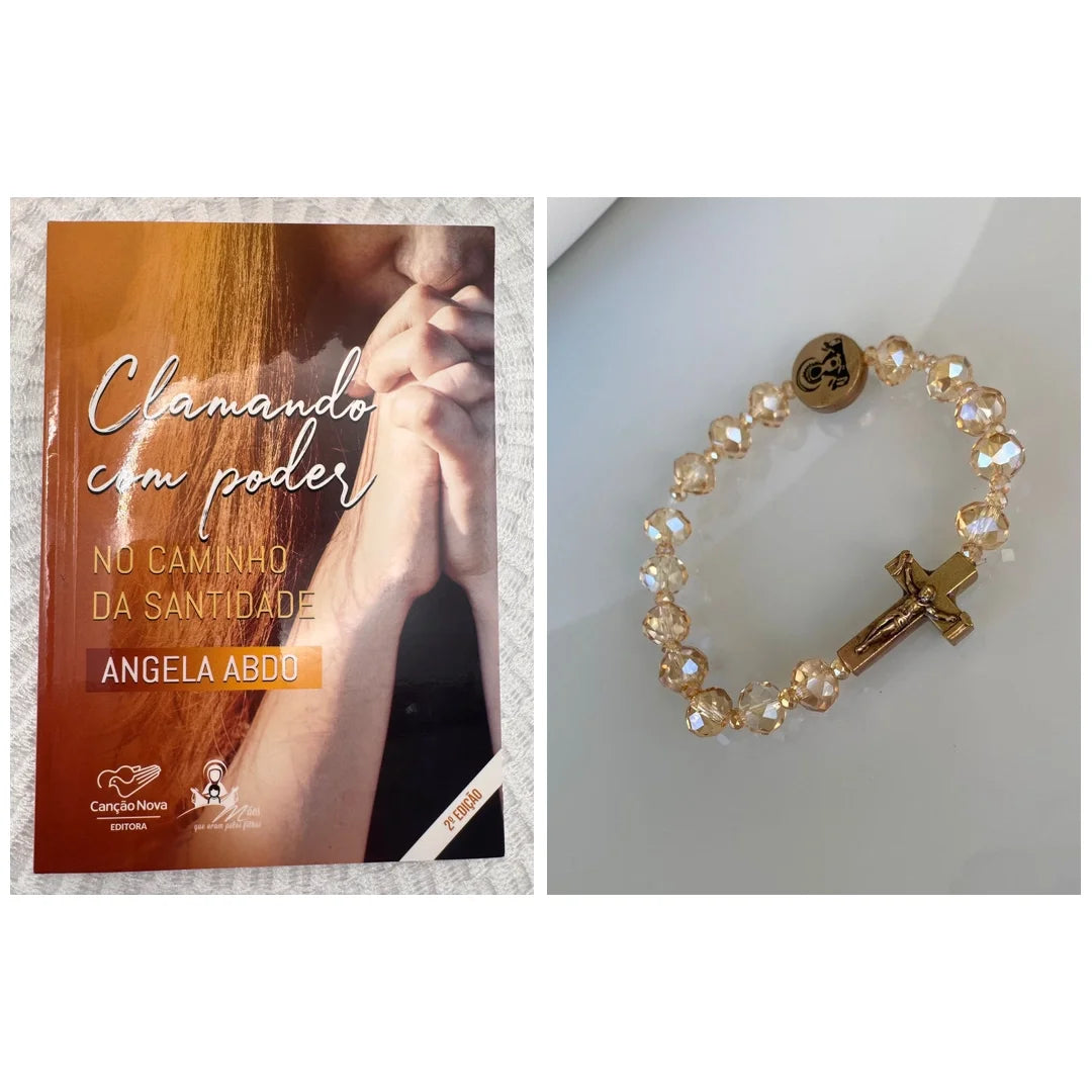 Com cristais em tom champanhe e partes metálicas banhadas a ouro, esta pulseira-terço traz um estilo delicado e atemporal. Um acessório cheio de significado, que acompanha a mãe no dia a dia como sinal de fé, entrega e pertença ao movimento.
