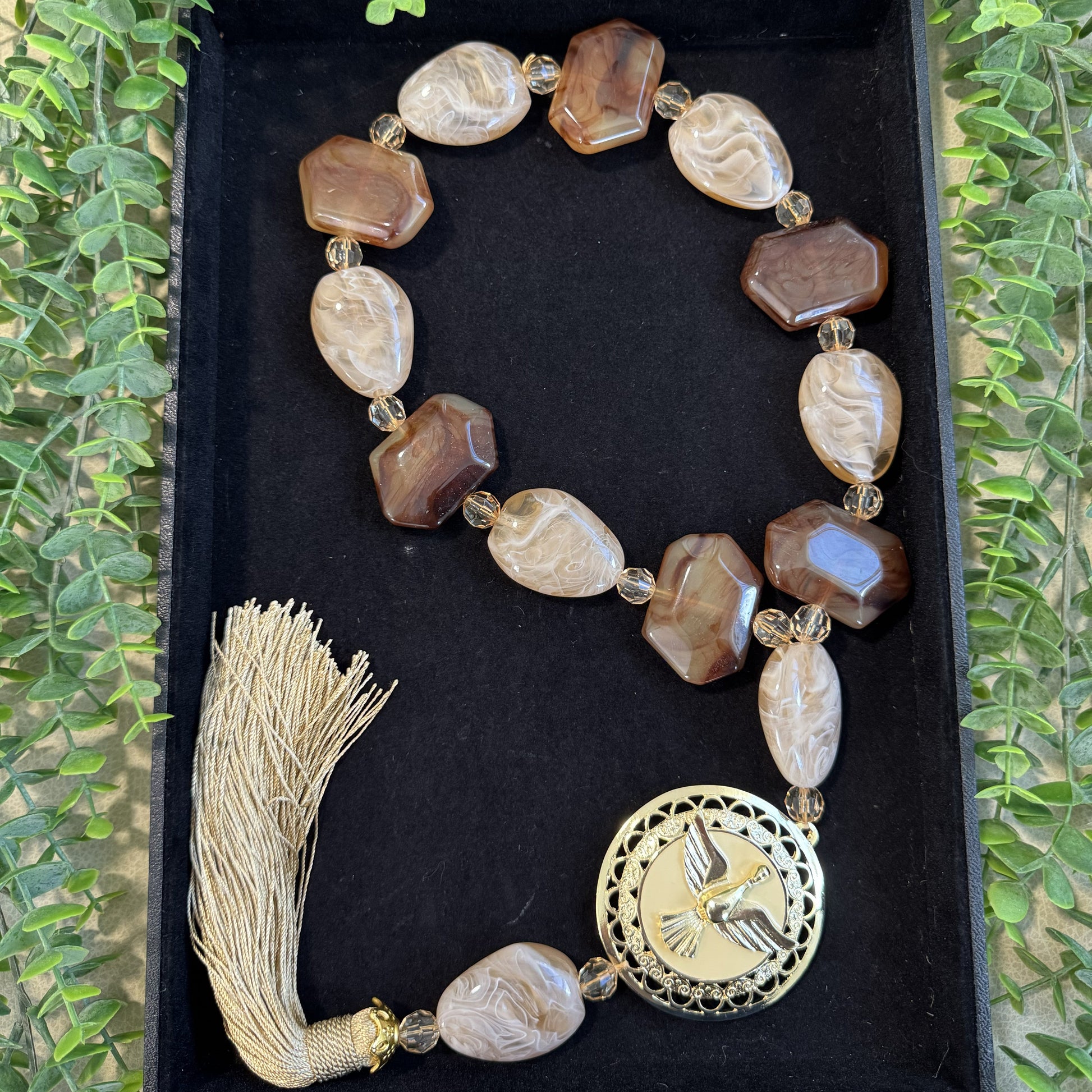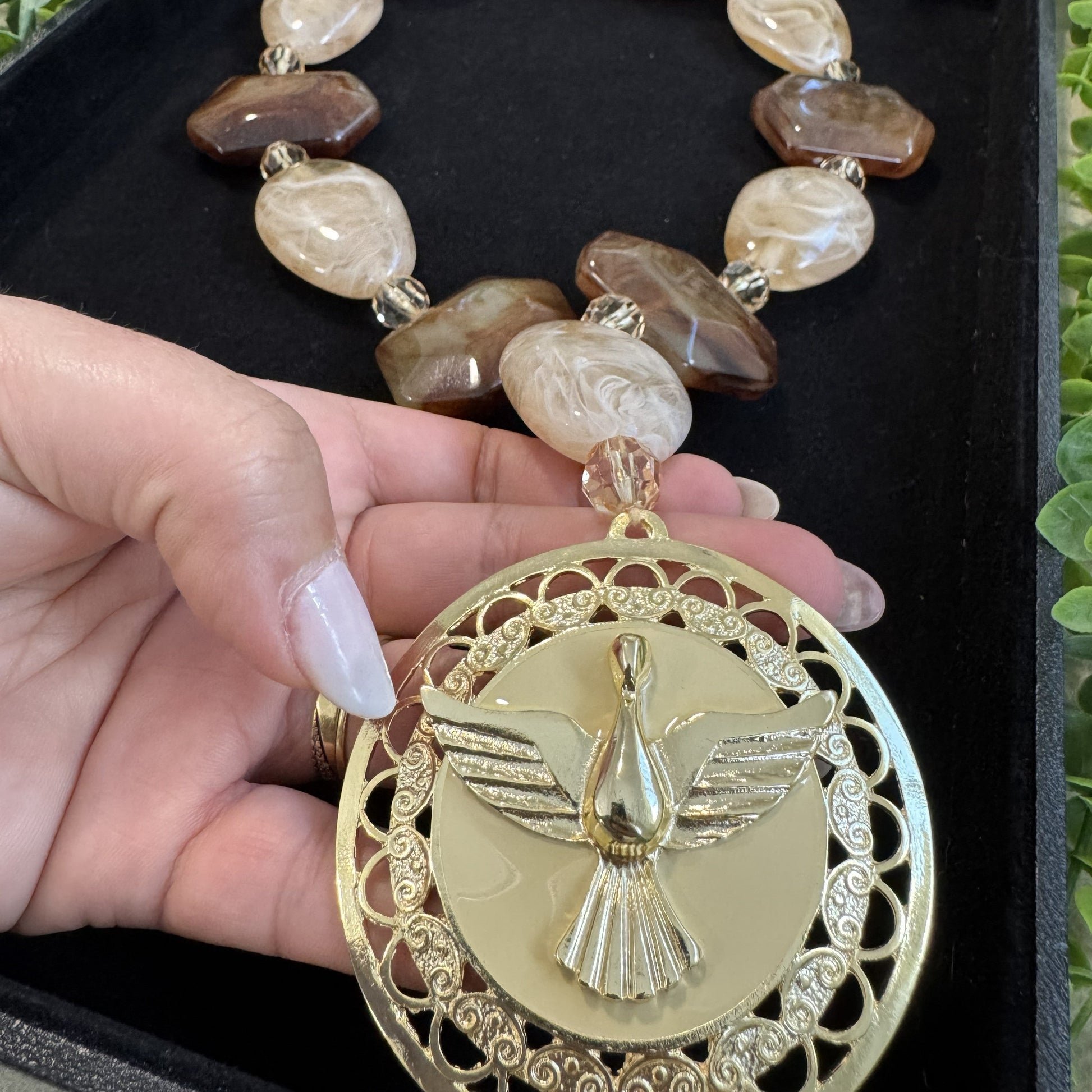 Com contas em resina em tons naturais e suaves, esta peça traz ao centro uma medalha em metal dourado com a imagem do Espírito Santo, símbolo da presença de Deus que ilumina, conduz e fortalece a vida espiritual.