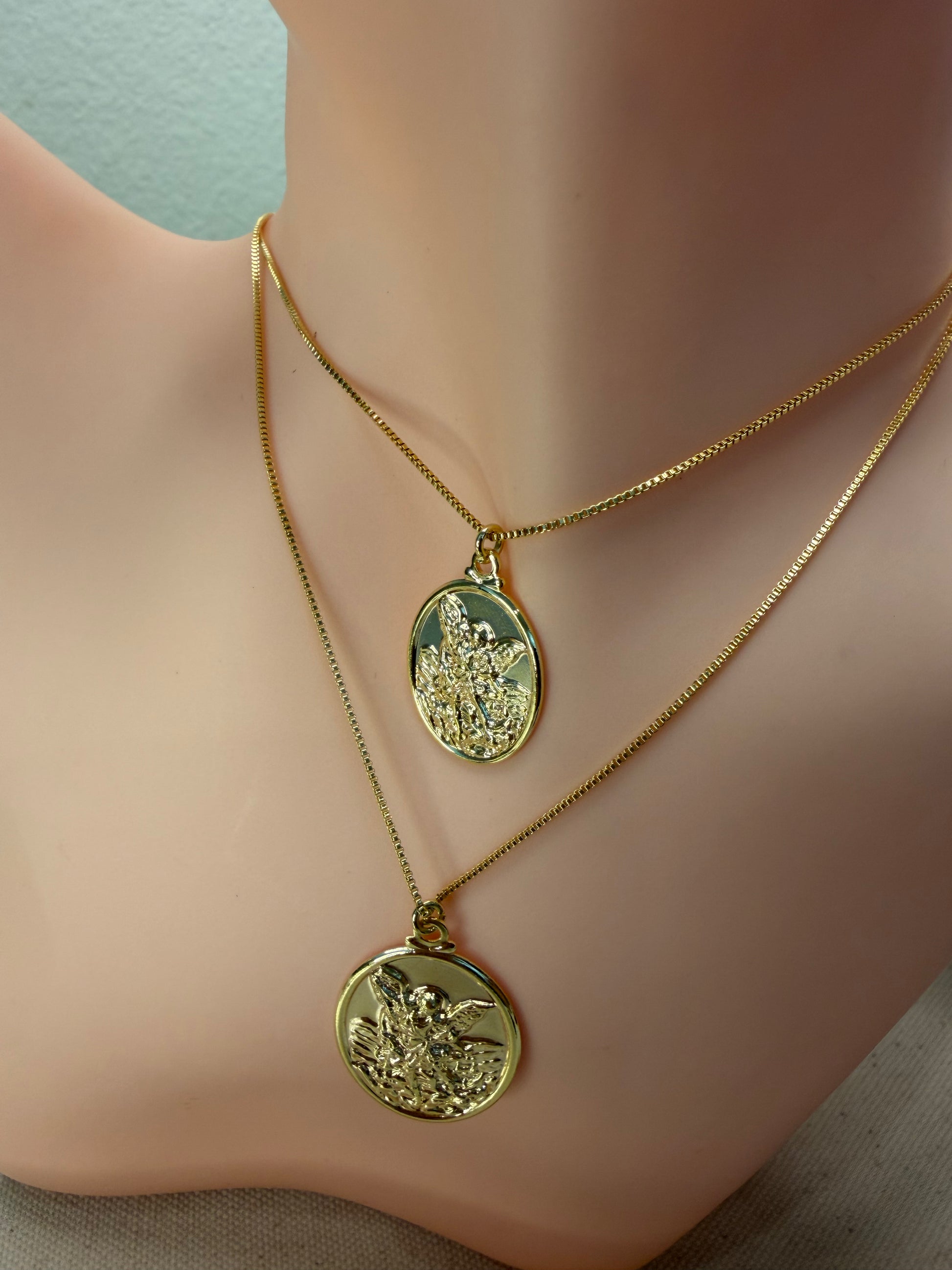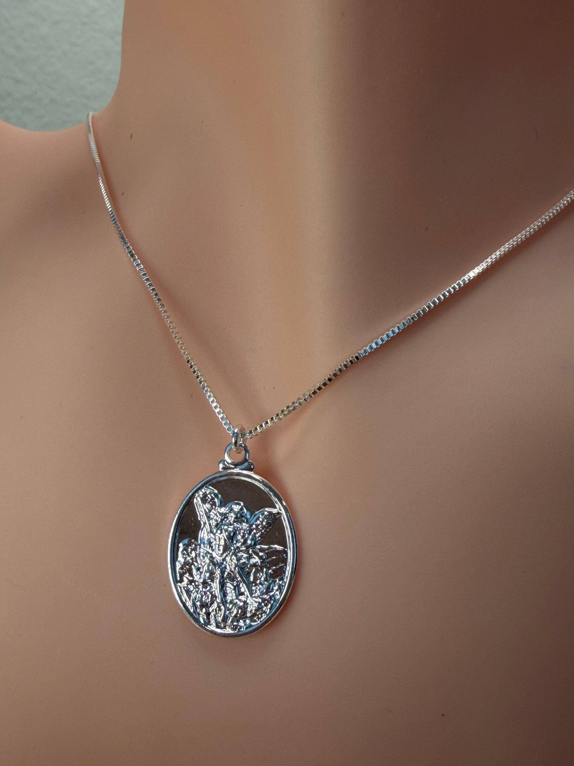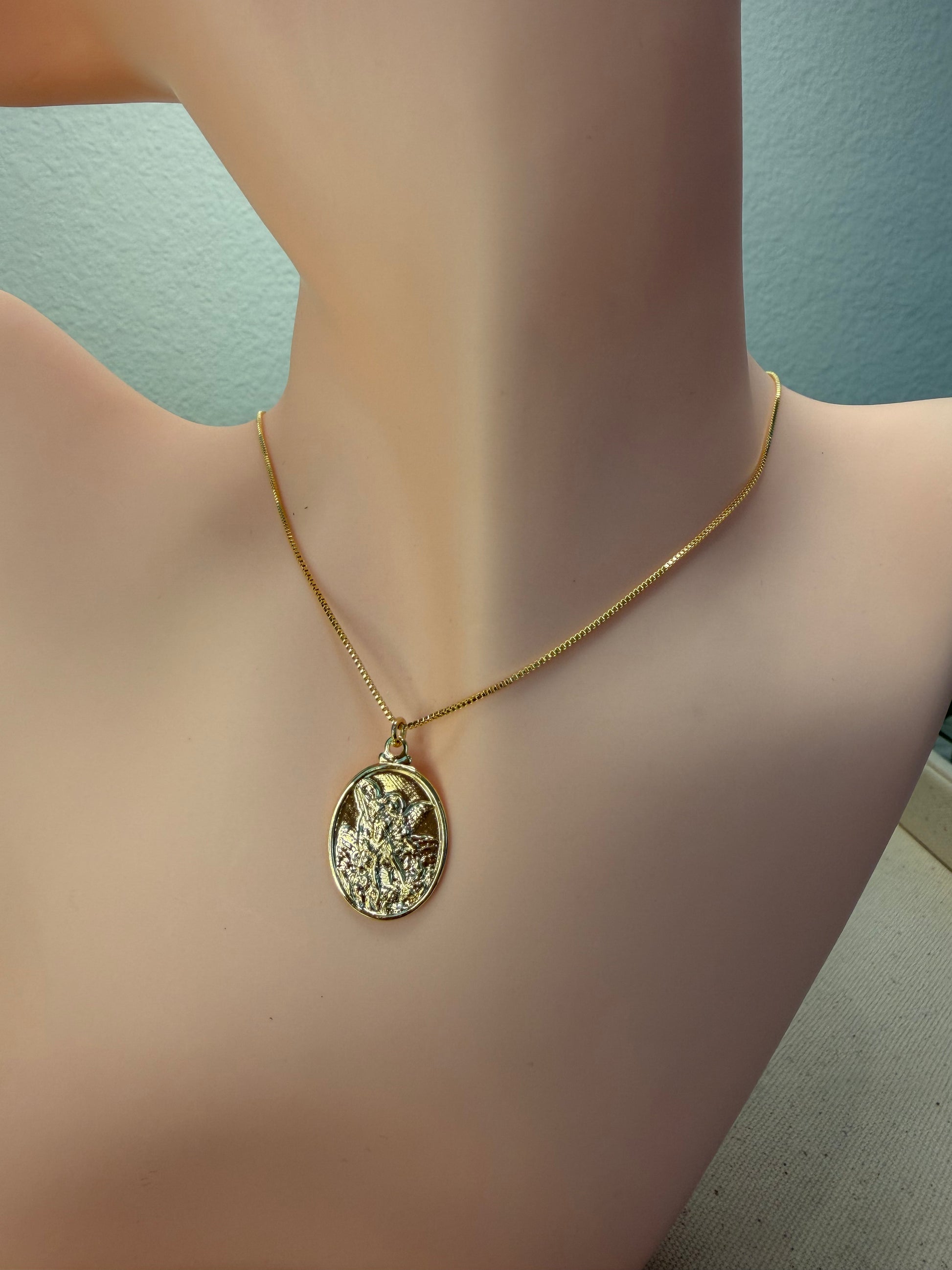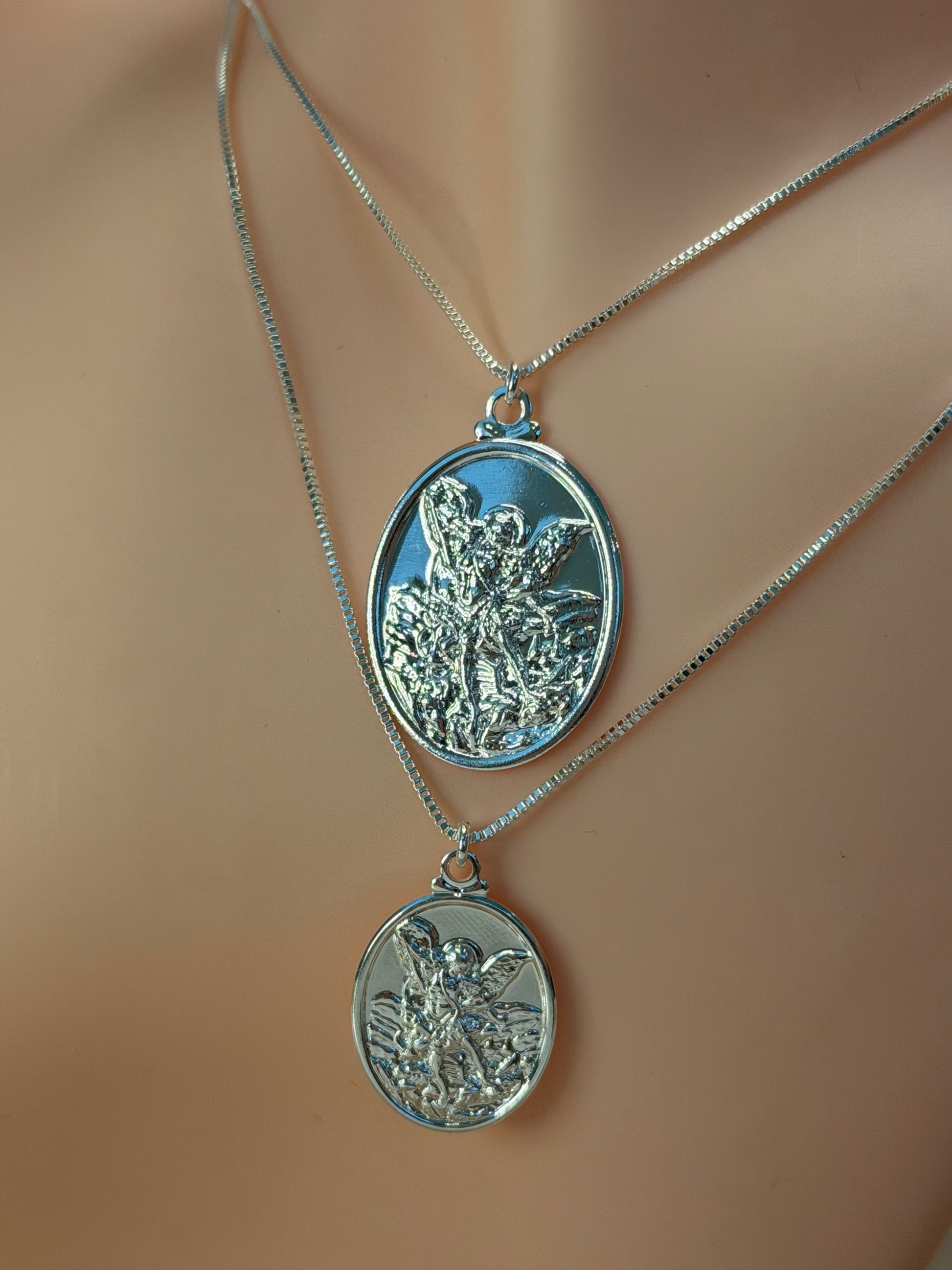 O pingente, com a imagem detalhada de São Miguel vencendo o dragão, está disponível em dois tamanhos — médio e grande — e acompanha uma corrente delicada de 45 cm.