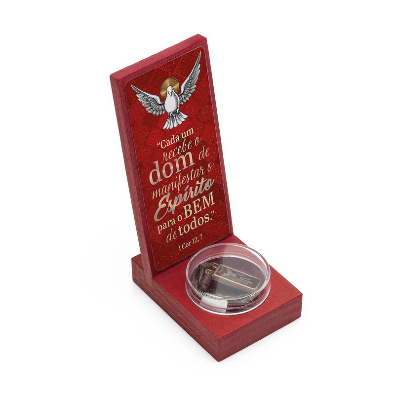 A textura natural da madeira, somada ao acabamento artesanal, evoca a força e a firmeza que o Sacramento da Crisma desperta em cada cristão.
