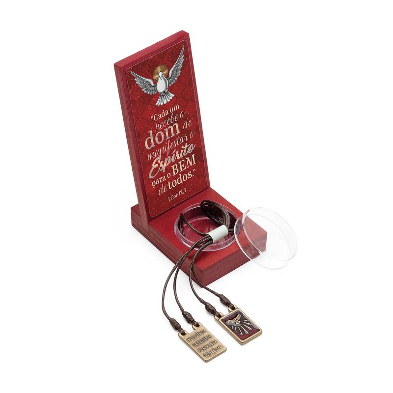 Na base, acomodado em um compartimento transparente, está um escapulário temático da Crisma, com medalhas em metal envelhecido que simbolizam proteção, consagração e o chamado ao testemunho cristão.
