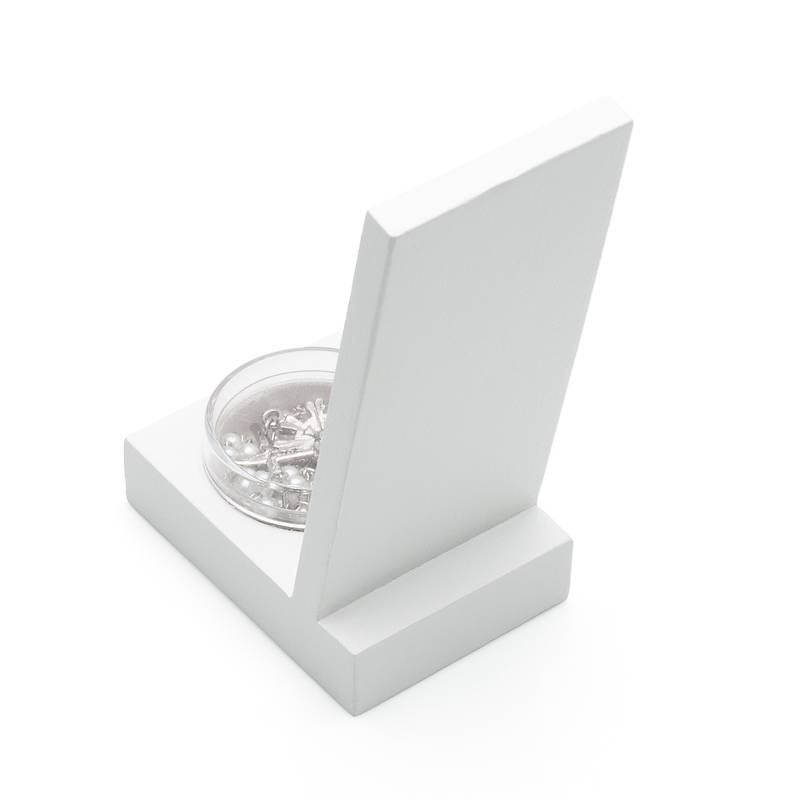 Na base, um compartimento transparente guarda um terço prateado com mini pérolas, delicado e cheio de simbolismo. Ele acompanha o crismando(a) em suas orações, fortalecendo a fé e recordando diariamente a presença do Espírito Santo em sua vida.