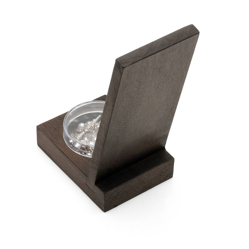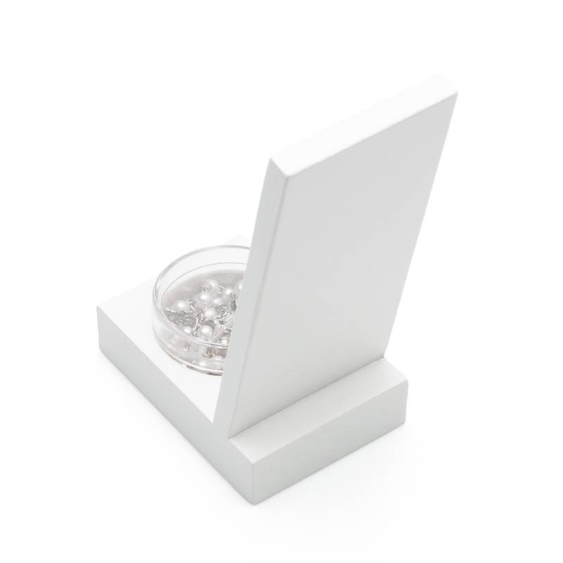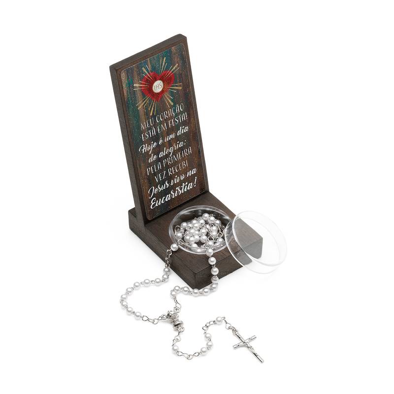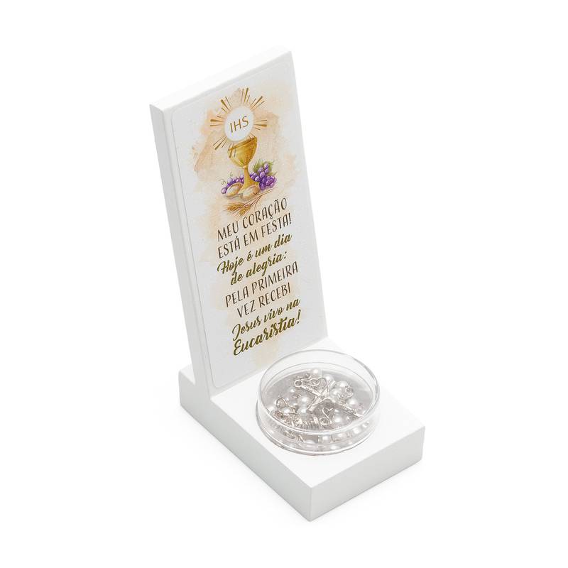 A peça acompanha um terço prateado com mini pérolas, acomodado com delicadeza no suporte frontal. Um gesto que torna a lembrança ainda mais completa, oferecendo ao presenteado um instrumento de oração para cultivar a intimidade com Deus.