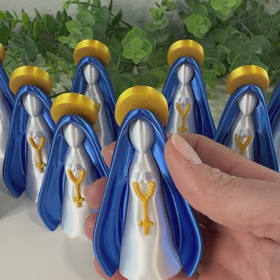 Produzida em impressão 3D com acabamento artesanal, essa imagem traz um design moderno e ao mesmo tempo profundamente devocional, com destaque para o manto em tom azul vibrante, a coroa dourada e o delicado terço em relevo, que tornam cada peça única e especial.