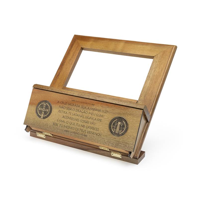 Feito em madeira, possui apoio inclinado para a Bíblia e uma gaveta inferior, perfeita para guardar terços, livrinhos de oração, escapulários ou pequenos objetos devocionais. A presença da Medalha de São Bento (ou detalhes relacionados ao santo) recorda a poderosa intercessão contra todo mal, tornando o porta Bíblia ainda mais especial.