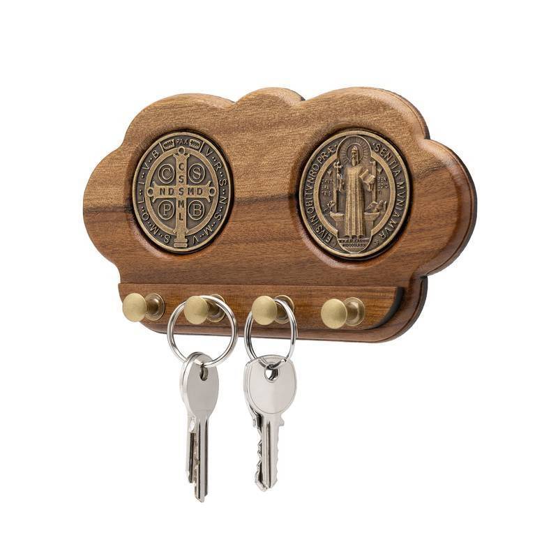 Além de organizar as chaves do dia a dia, este porta-chaves é um sacramental, que recorda diariamente a presença de Deus e a intercessão de São Bento sobre o lar e a família.