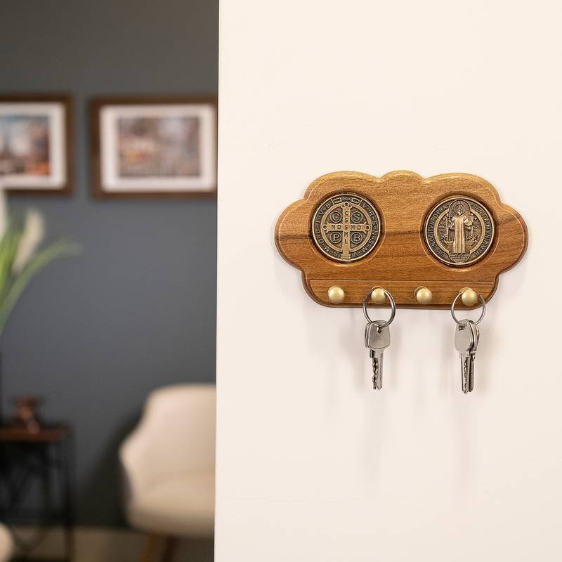 Este porta-chaves em madeira traz a poderosa Medalha de São Bento, reconhecida pela Igreja como um forte símbolo de proteção espiritual contra todo mal. Com design elegante e formato oval, a peça une beleza, funcionalidade e devoção, tornando-se um verdadeiro sinal de fé logo na entrada da casa.