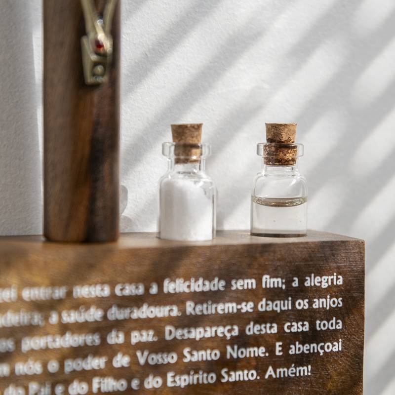 A peça acompanha dois pequenos vidrinhos, ideais para colocar água benta e sal bento ou água benta e óleo bento, conforme a devoção de cada família. Esses elementos ajudam a fortalecer o hábito da bênção do lar, especialmente ao sair e ao chegar em casa.