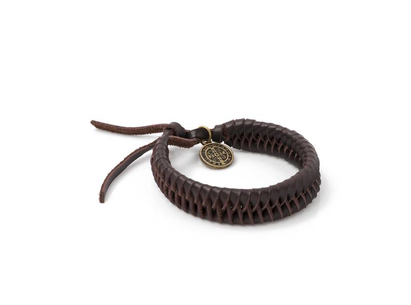 Confeccionada em couro sintético marrom escuro, possui acabamento trançado artesanal que confere resistência e um visual rústico e elegante. A pulseira é regulável, adaptando-se confortavelmente ao pulso. O destaque fica por conta da Medalha de São Bento em metal com acabamento em ouro velho, símbolo tradicional de proteção espiritual e confiança em Deus.