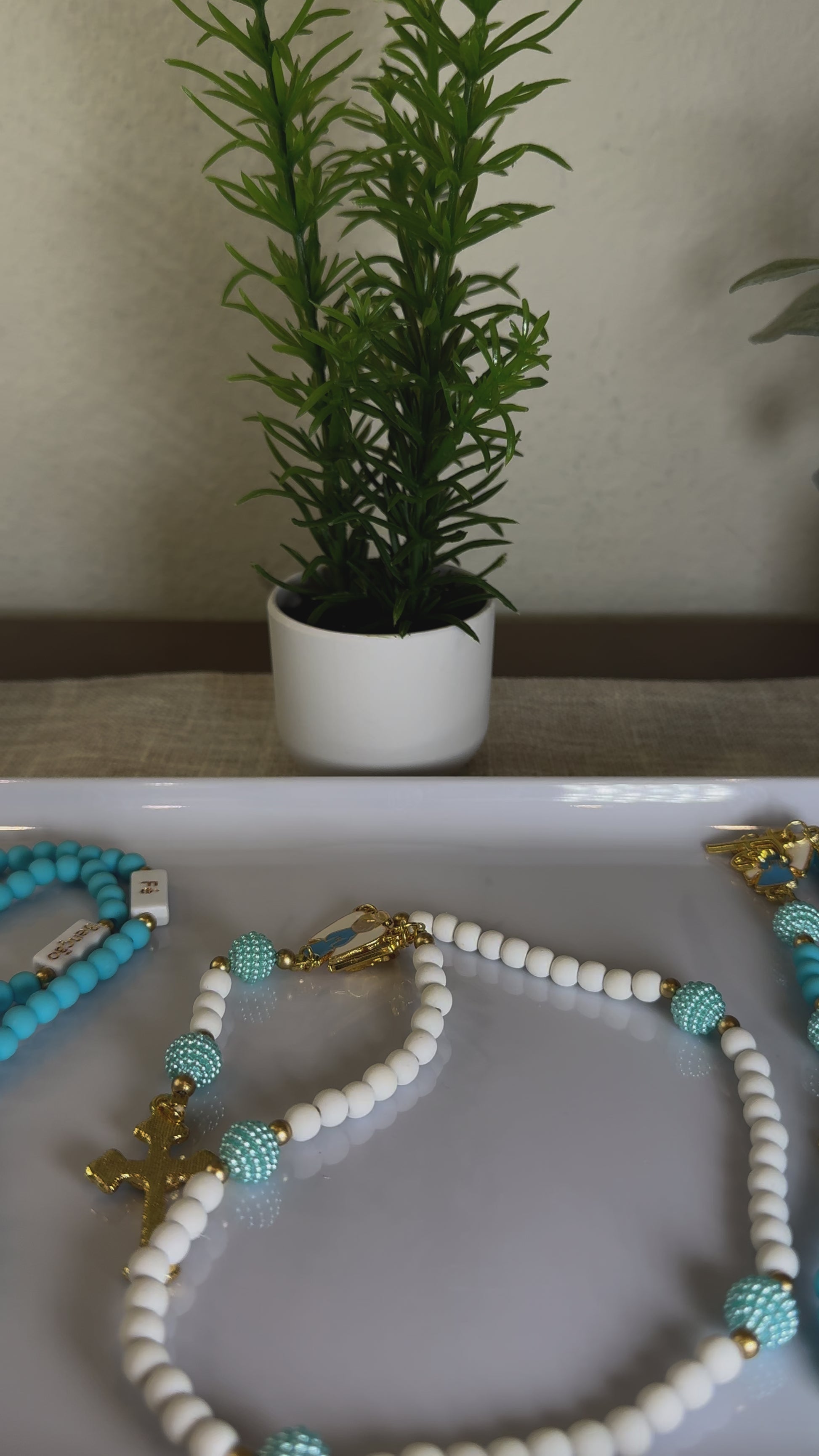 Esse lindo terço combina delicadeza e fé. 🙏 Suas contas menores são emborrachadas proporcionando um toque macio, enquanto as contas maiores trazem uma textura diferenciada com bolinhas ou palavras. Contém um pingente escrito Fé. As ferragens são banhadas a ouro ✨ (não é ouro maciço). Para preservar a beleza do terço, evite contato com cremes hidratantes e perfumes.