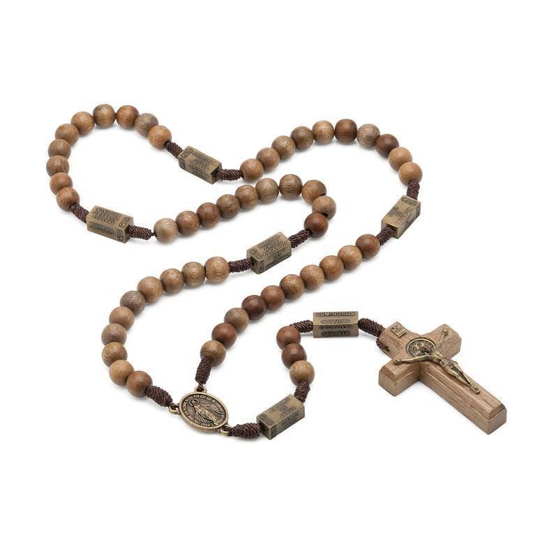Feito com contas de madeira natural de 10 mm, cordão trançado e metais em acabamento ouro velho, este terço é elegante e durável.