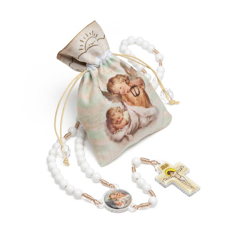 Acompanha um saquinho estampado com Anjinhos, perfeito para guardar o terço, levar para a igreja, colocar no berço, mochilinha ou deixar ao lado da cama. Um mimo que transmite cuidado, proteção e o amor dos Anjos da Guarda.